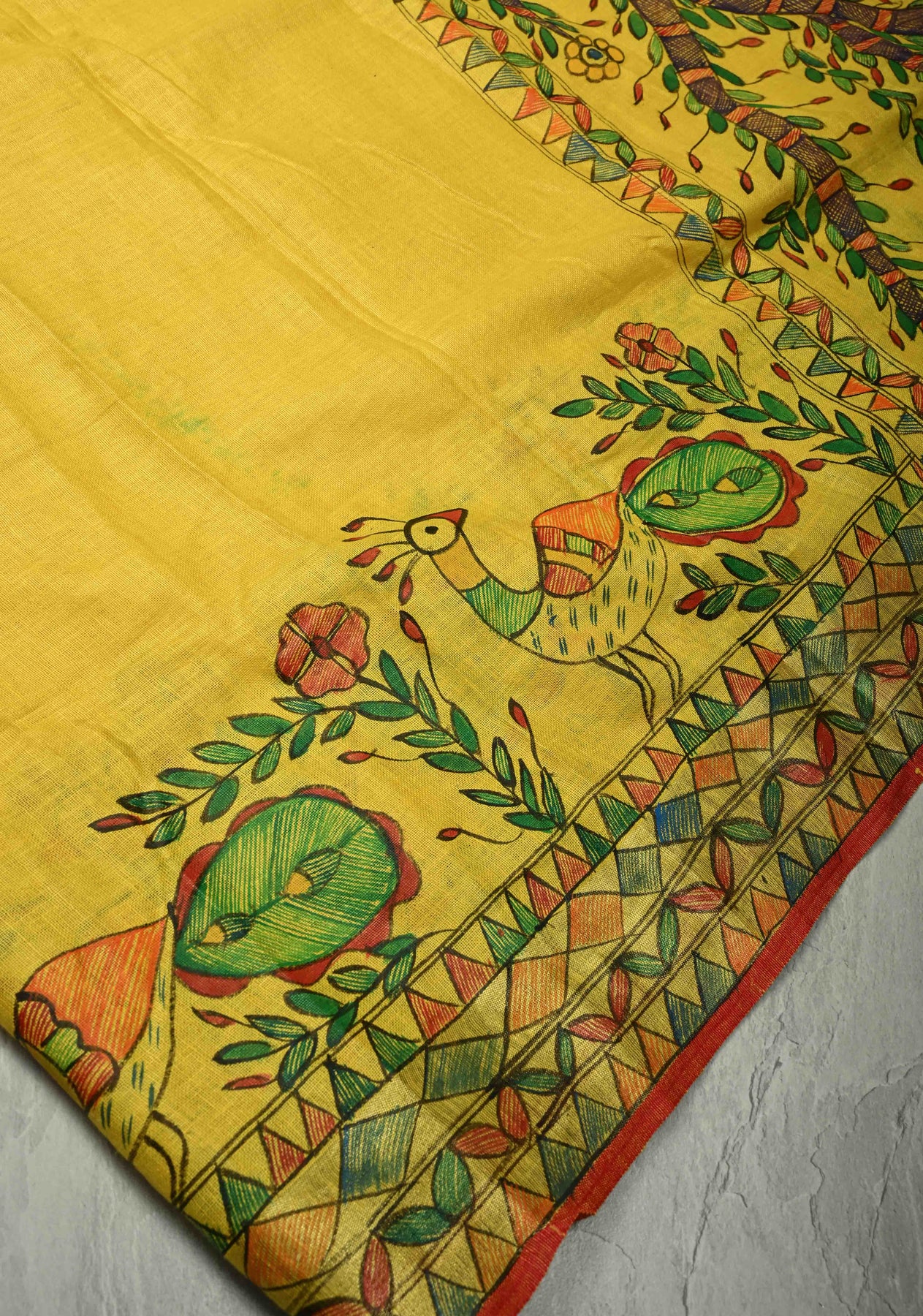 The Yellow Linen by CottonSaree with Madhubani Hand-Painted artwork is a vibrant fusion of tradition and artistic elegance. Crafted from pure linen, the saree offers a breathable, lightweight drape that feels effortlessly comfortable. Its yellow hue adds a cheerful, radiant charm, beautifully complementing the intricate Madhubani hand-painted motifs inspired by nature, mythology, and folk traditions. Each stroke is meticulously crafted by skilled artisans, making every saree a unique piece of wearable art. Perfect for cultural events, festive occasions, or elegant daytime outings, this saree blends heritage craftsmanship with contemporary grace.