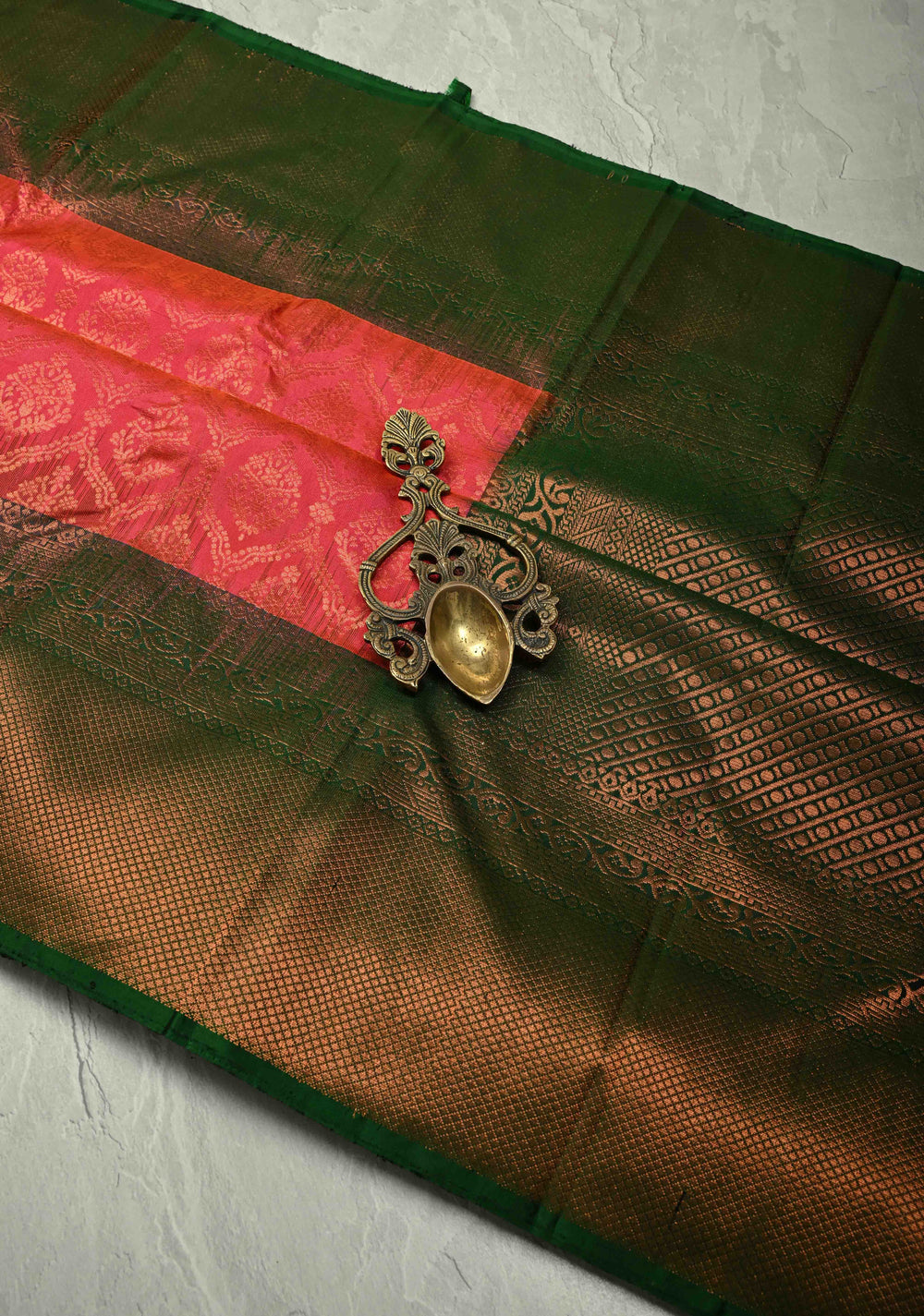 Coral Pink Banarasi Kora Silk Saree with Sona Rupa Buttas and Zari Border | SILK MARK CERTIFIED