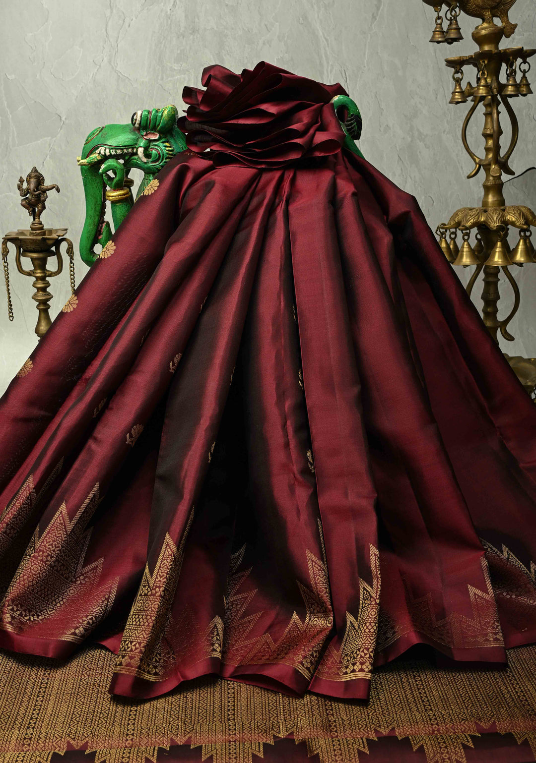 Deep maroon Kanjivaram Soft Silk Saree with Floral Zari Buttas and Temple Zari Border | SILK MARK CERTIFIED