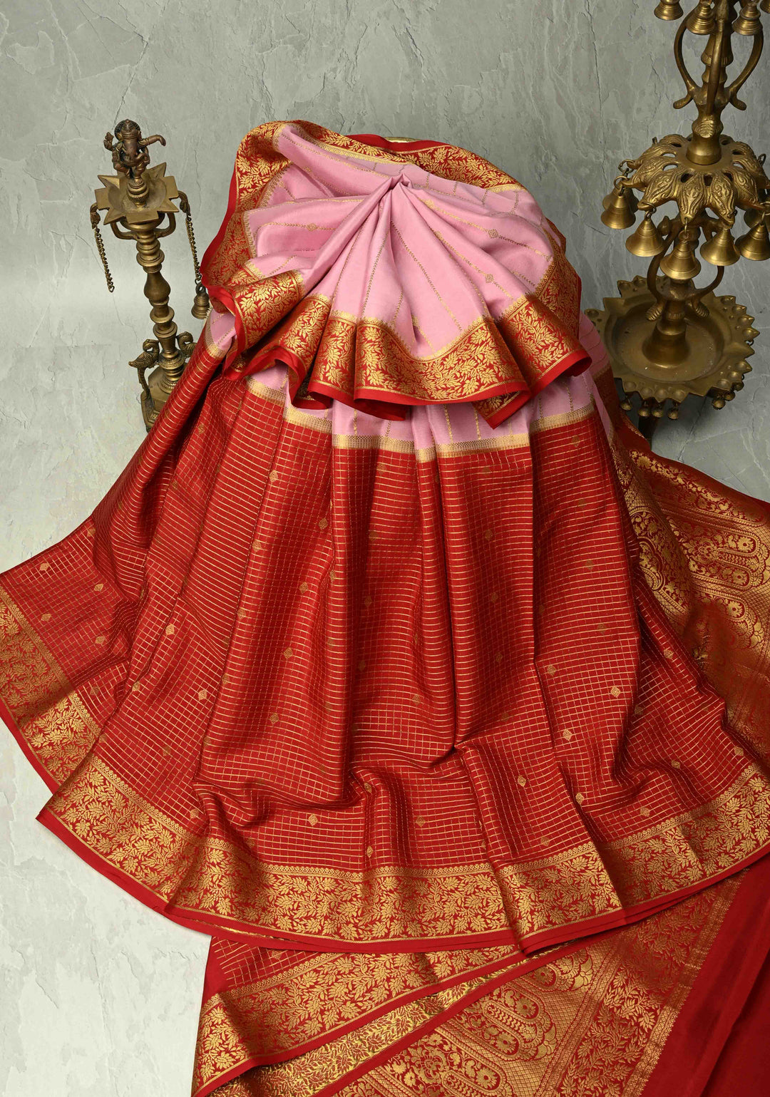 KSIC Grade Thickness Rose Pink- Red Pure Mysore Silk Saree with Vertical Zari Stripes and Contrast Zari border | SILK MARK CERTIFIED