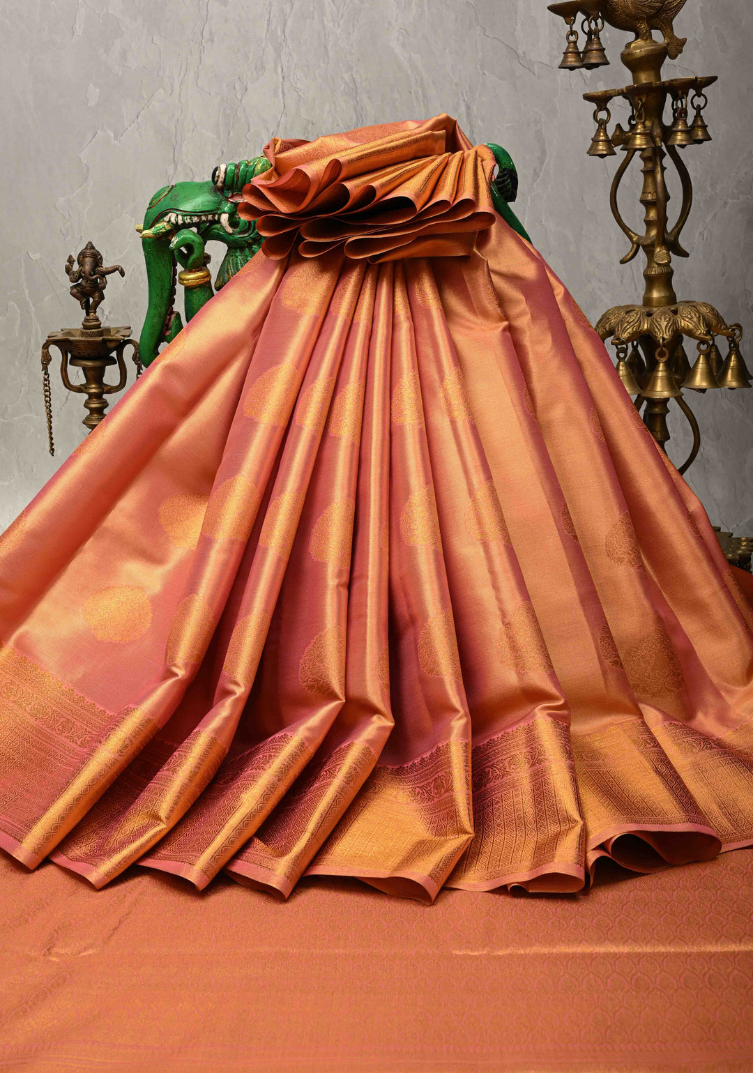 Gold -Pink Tissue Kanjivaram Pure Silk Saree with Distinct Motifs on Half Zari Border | SILK MARK CERTIFIED