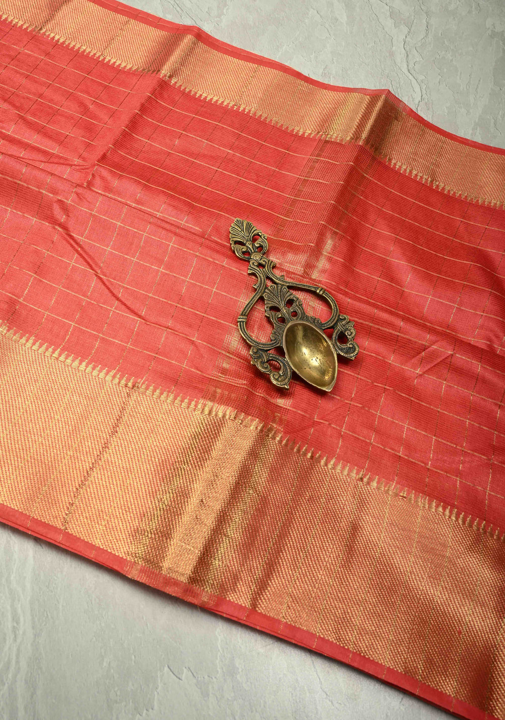 Dark Pastel Red Semi Tussar Saree with Zari Checks and Temple Zari Border