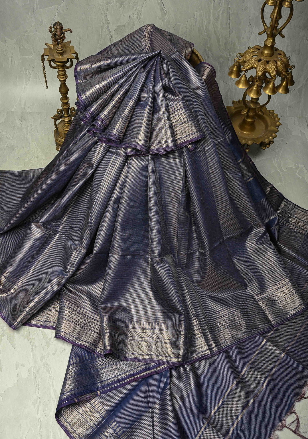 Gray Mysore Silk Saree with Floral Zari Buttas and Fancy Zari Border| SILK MARK CERTIFIED