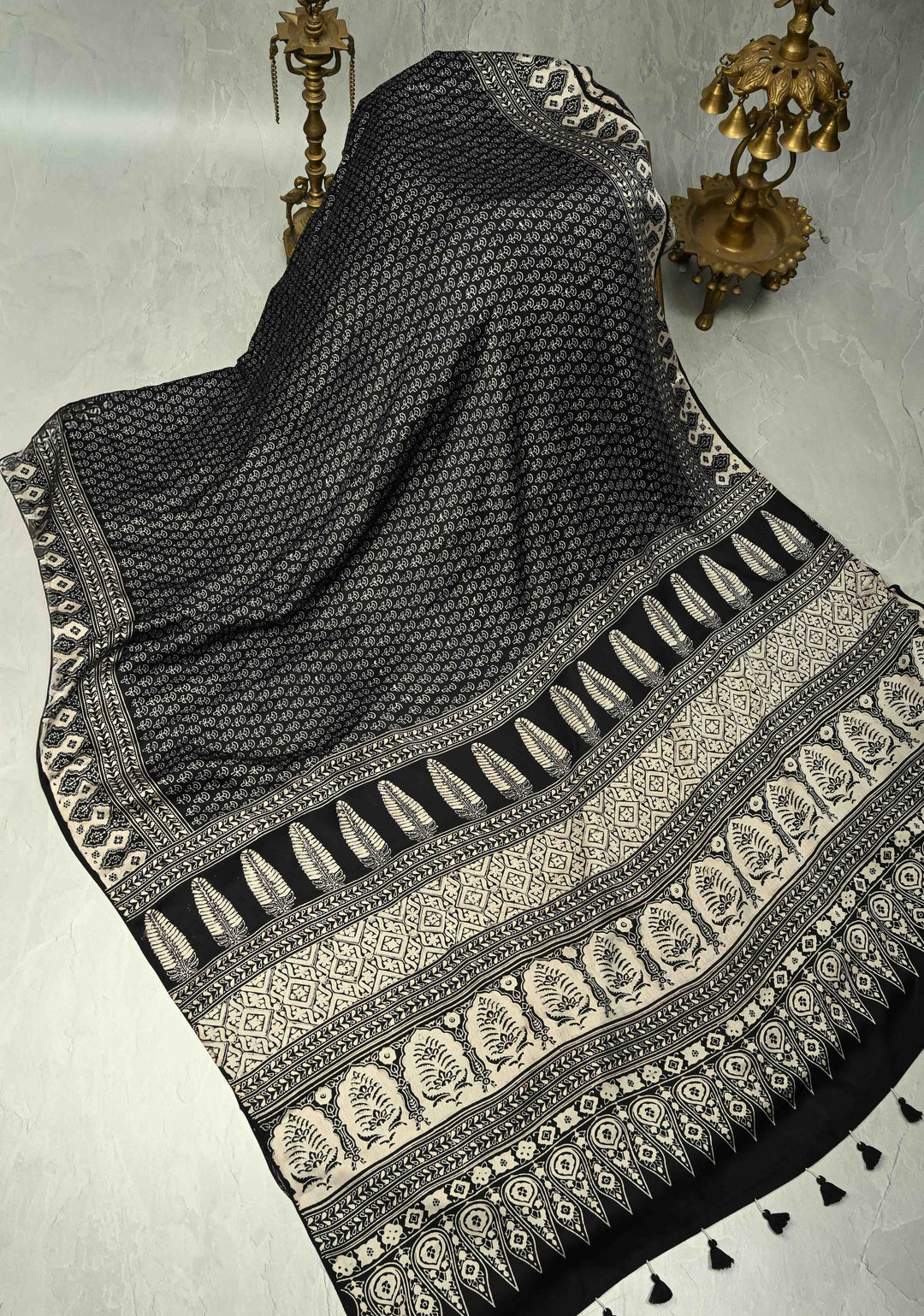 Black and White Modal Silk Saree with Ajrakh Hand Block Print