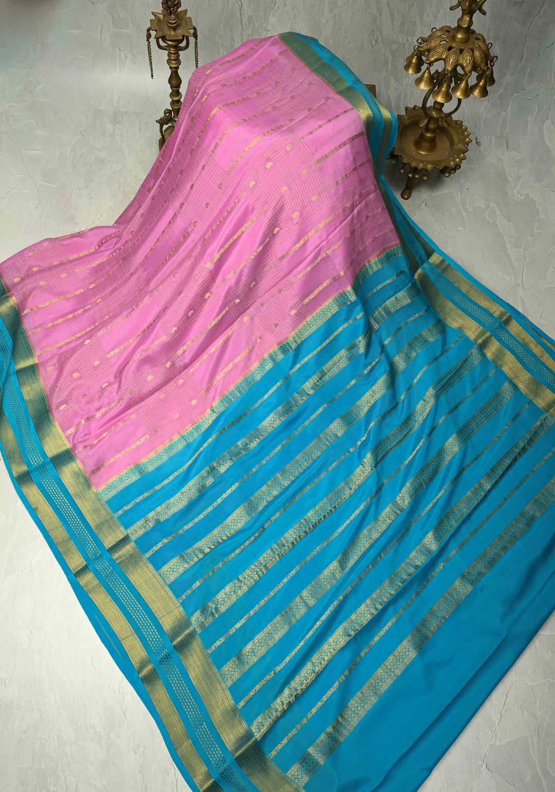 Bubblegumpink Mysore Silk Saree with Checks Zari stripes Buttis and Zari Border | SILK MARK CERTIFIED