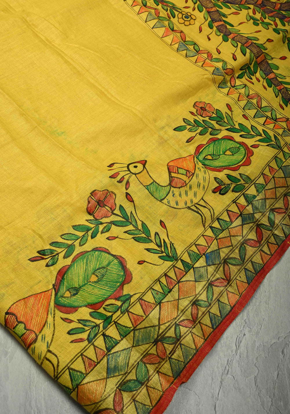 Yellow Linen by Cotton Saree with Madhubani Hand-Painting details