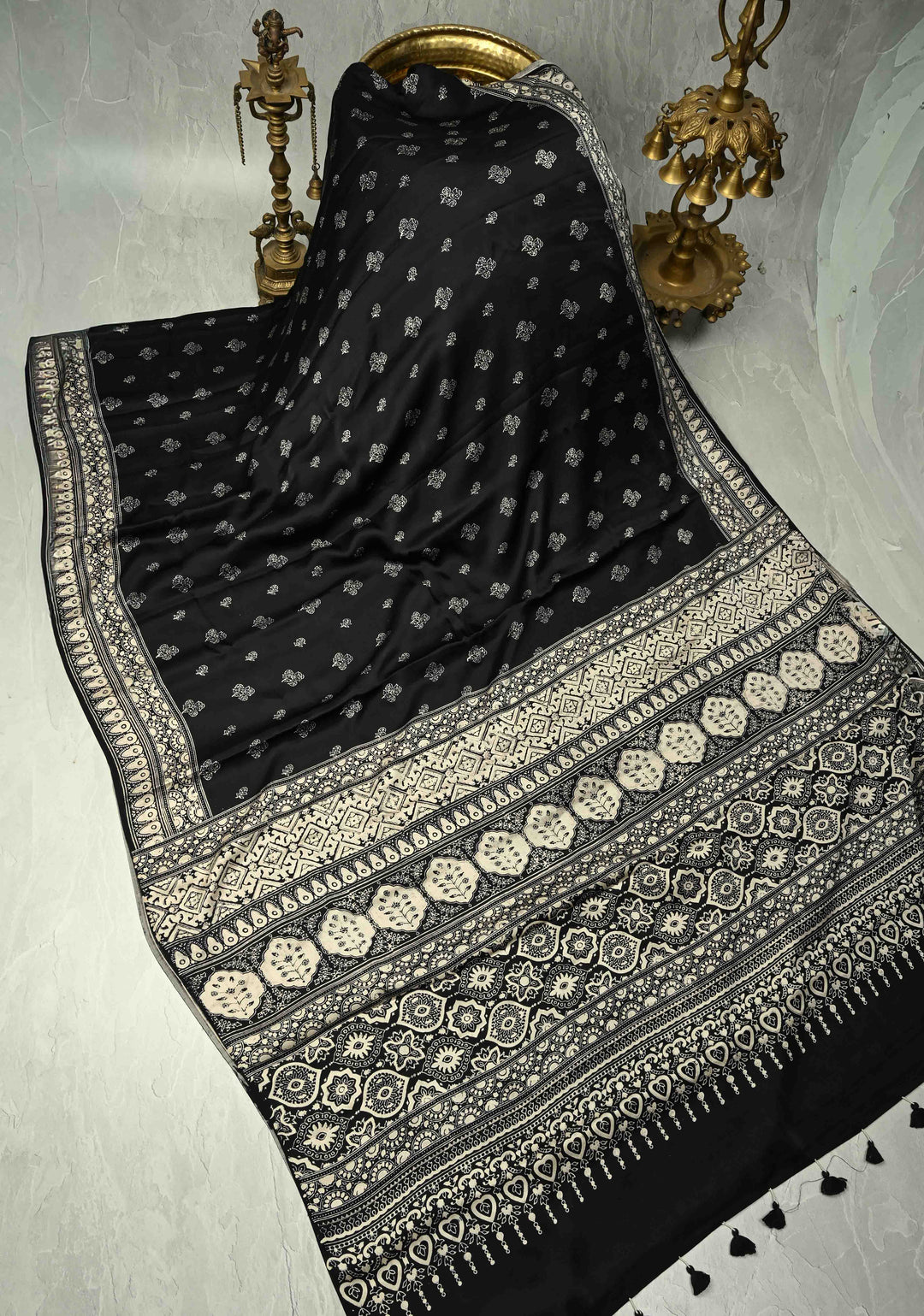 Black Hand Block Print on Modal Silk Saree with Ajrakh Pallu