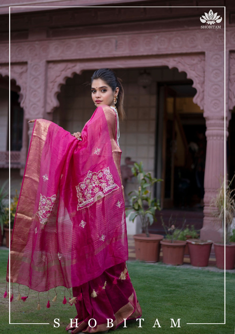 Dark Magenta Semi Tussar Saree with Zari Brocade and Minimal Silver Zari Border