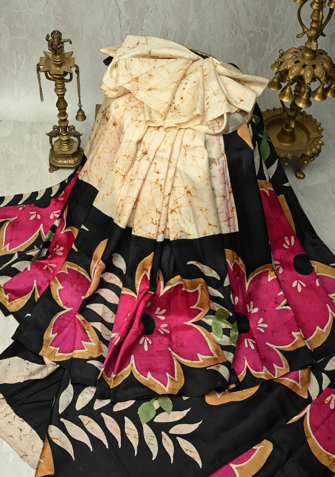 Beige Bishnupuri Silk Saree with Floral Hand Wax Batik Print and Skirt Border, Pallu| SILK MARK CERTIFIED