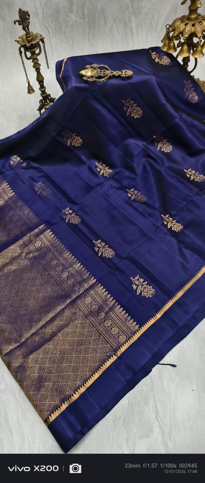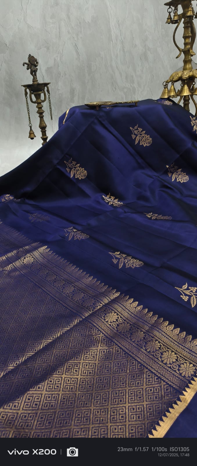 Dark Ink Purple Kanjivaram Soft Silk Saree with Floral Zari Buttas and Zari Border | SILK MARK CERTIFIED
