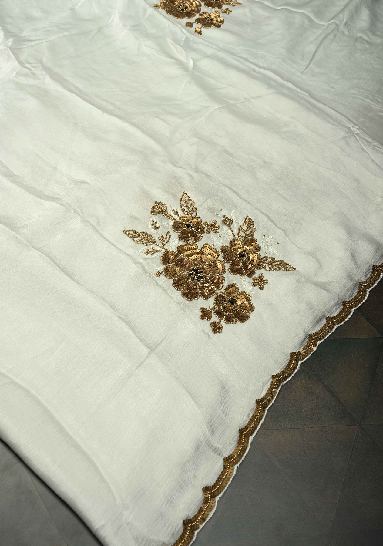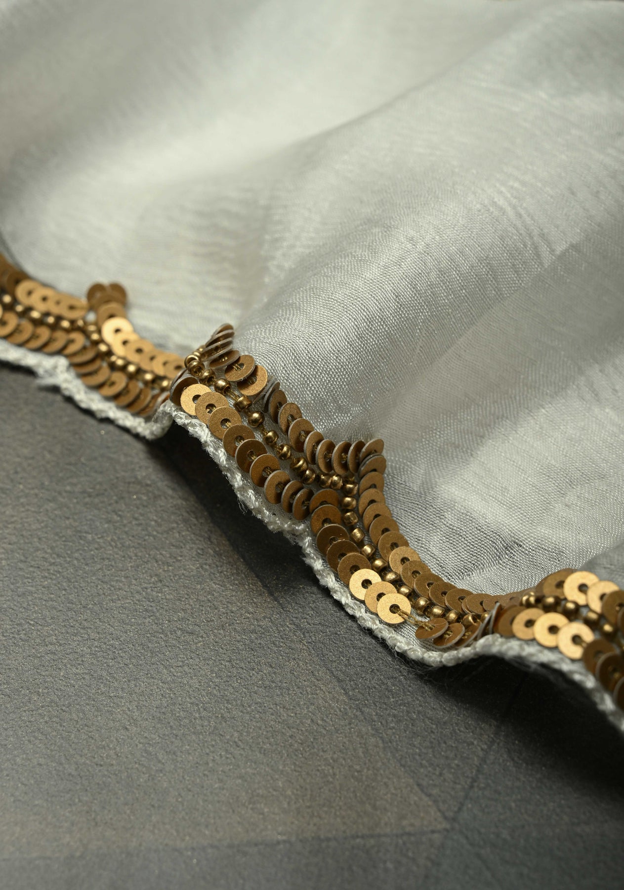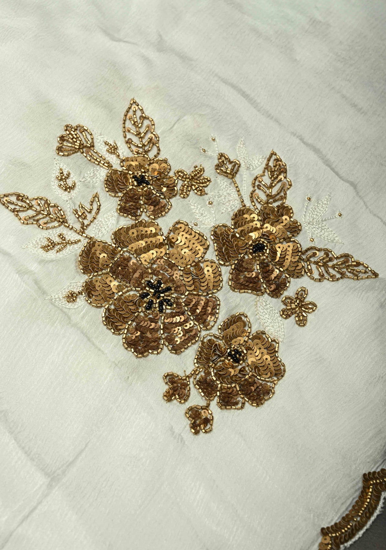 The saree is adorned with antique matte finish cutdana, delicate sequins, and moti embellishments, creating a refined shimmer that catches the light beautifully without being overpowering. The intricately crafted scallop border enhances the overall look with a modern yet classic finish, adding definition and finesse to the drape.