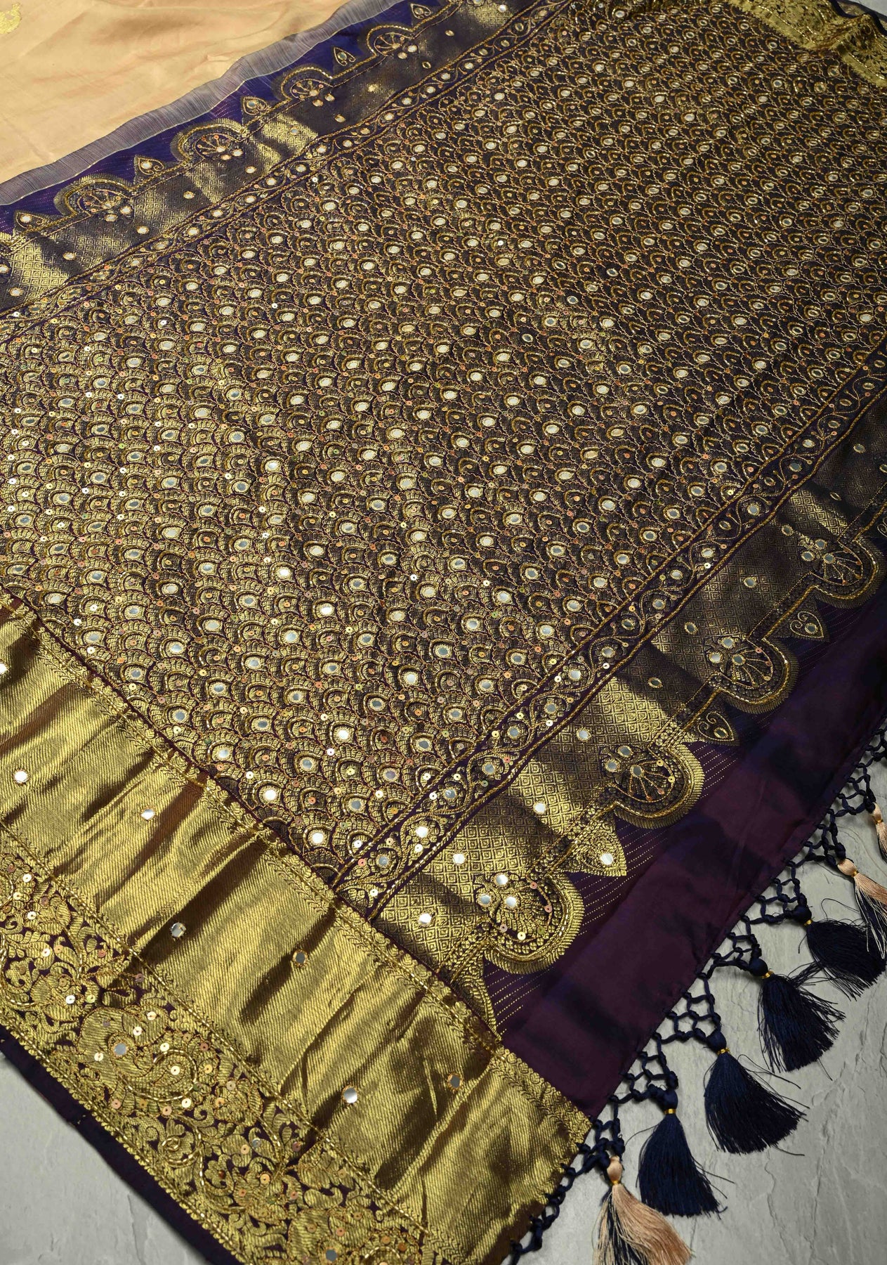 Beige Sequins, Cutdana, Mirror Work on Kanjivaram Pure Silk Saree with Peacock Buttas and Contrast Zari Border | SILK MARK CERTIFIED