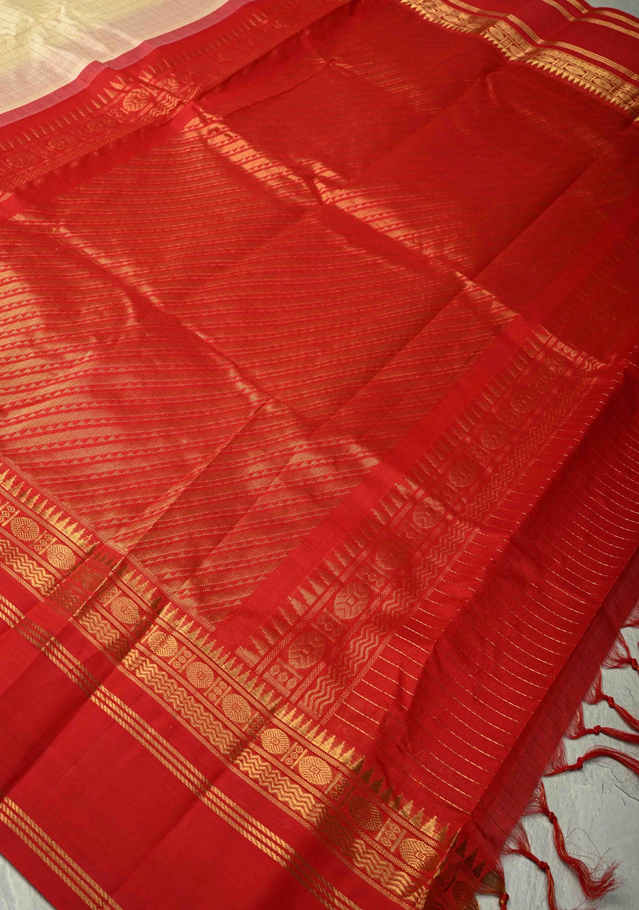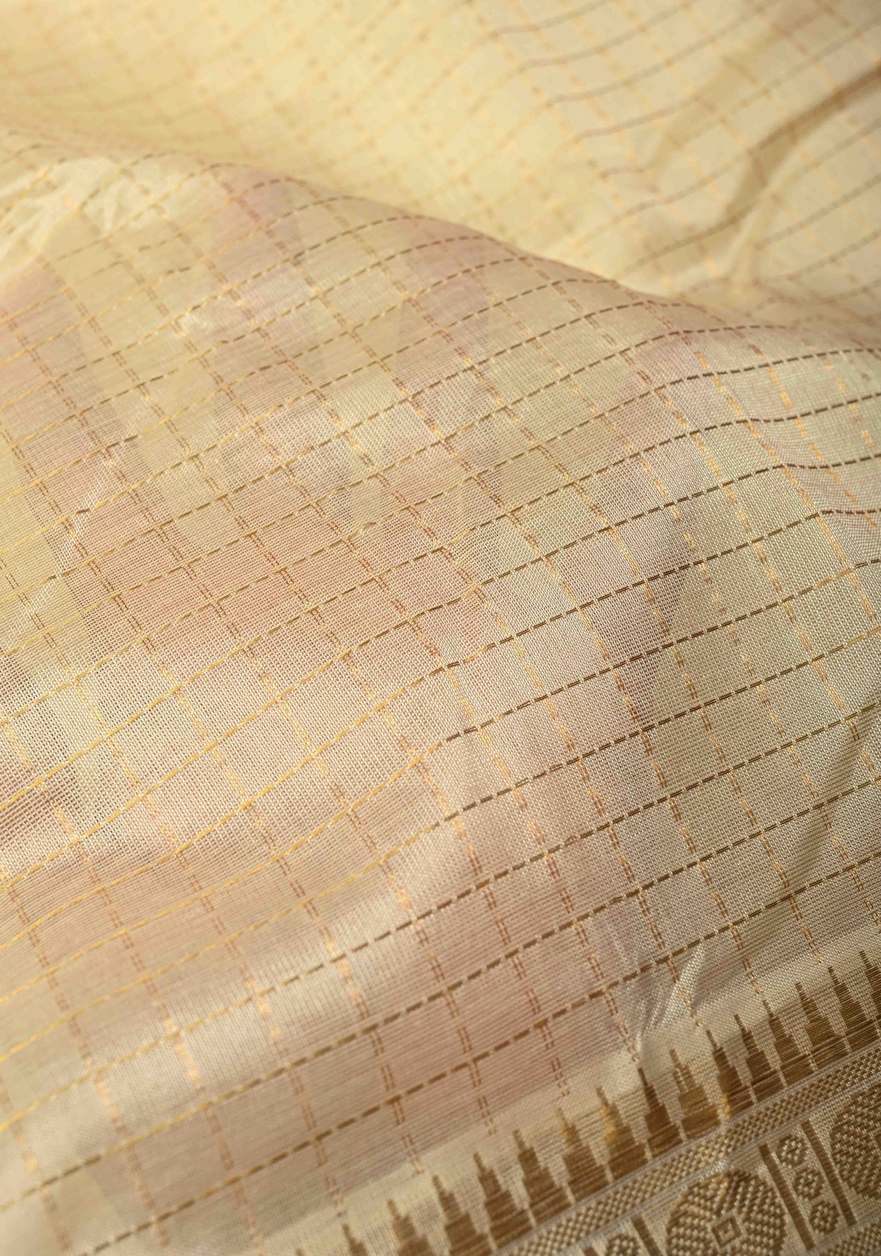 Elevate your ethnic wardrobe with this elegant Cream Kanchi Silk Cotton Saree, handwoven with intricate zari checks that add a subtle shimmer to the soft cream base. Crafted from 100% silk cotton, this handloom saree offers a lightweight, breathable, and drape, perfect for festive occasions, weddings, or traditional celebrations.