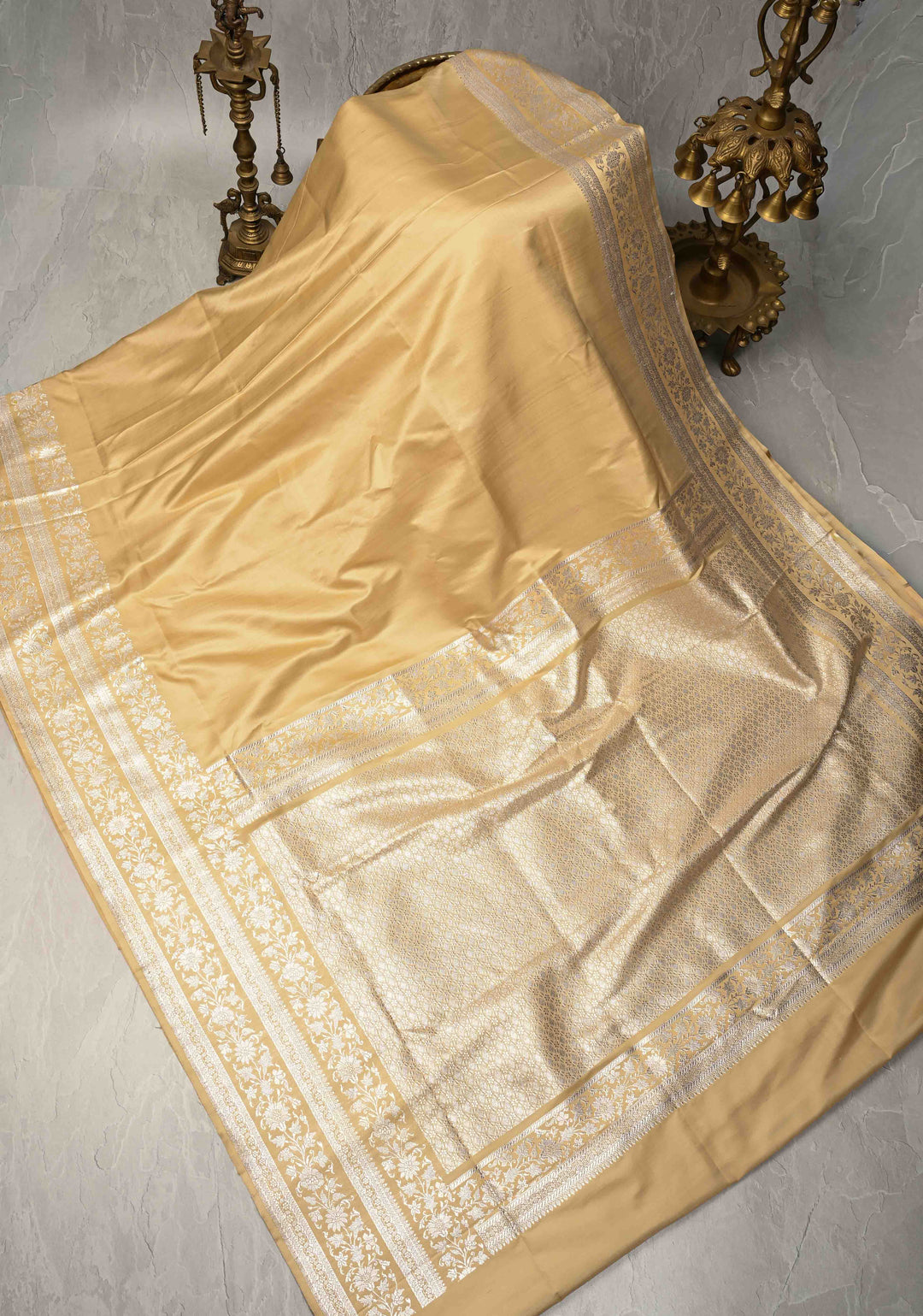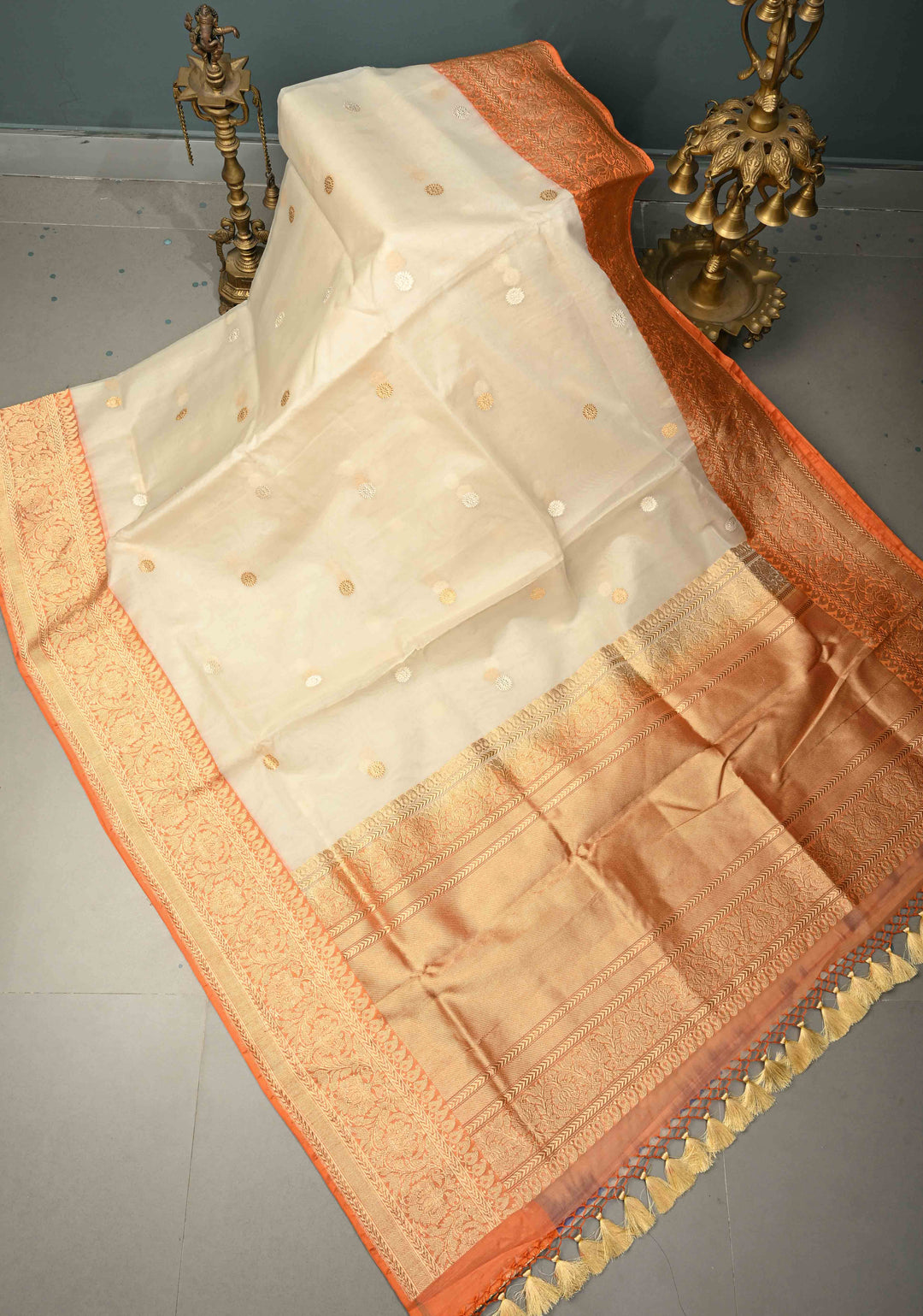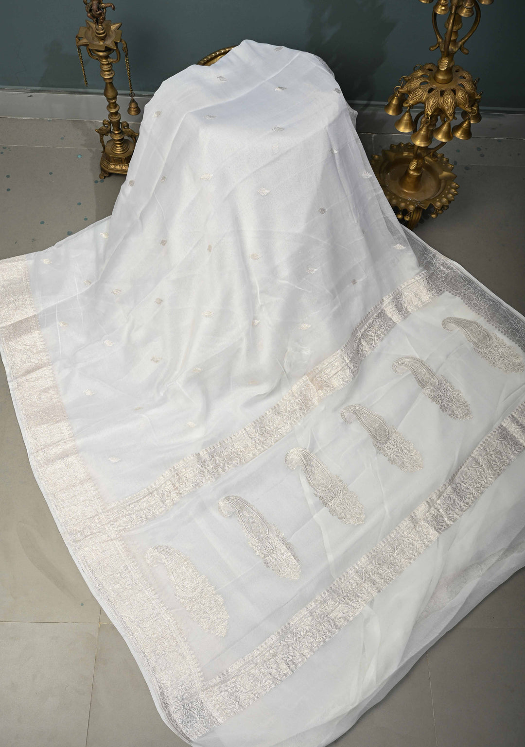 A white silk saree with intricate gold zari work is considered auspicious and is often chosen for bridal rituals.