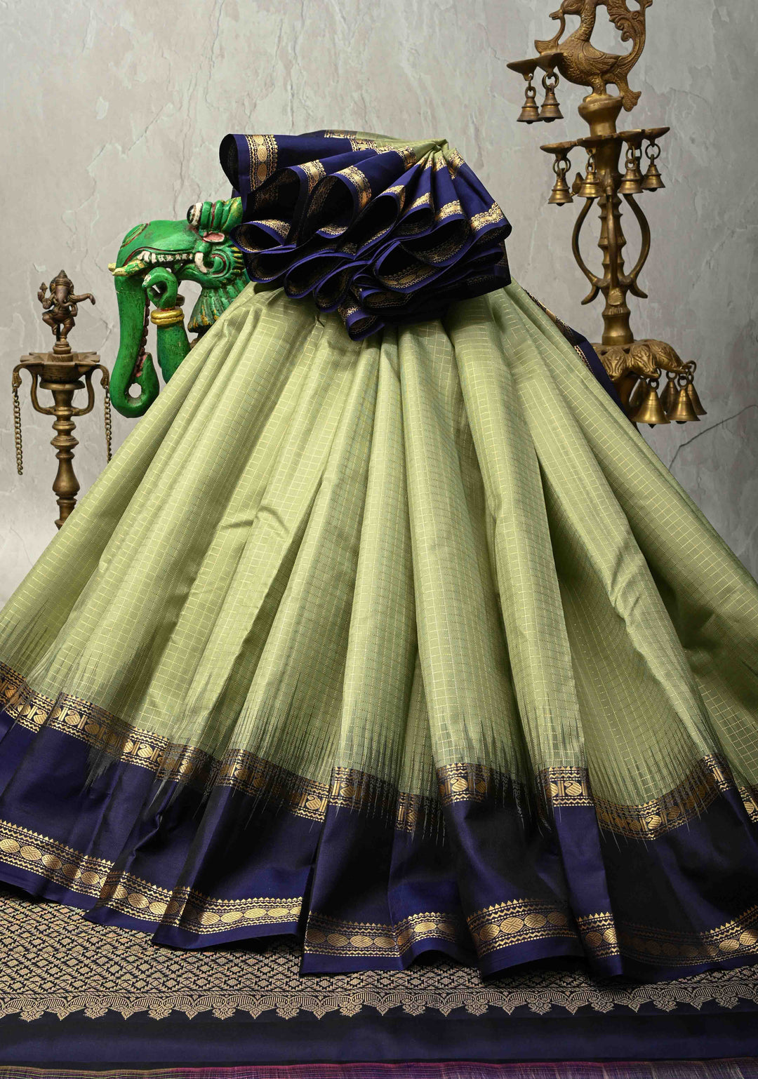 Choose a Kanjeevaram silk saree with a bold zari border for a grand temple visit during festivals.