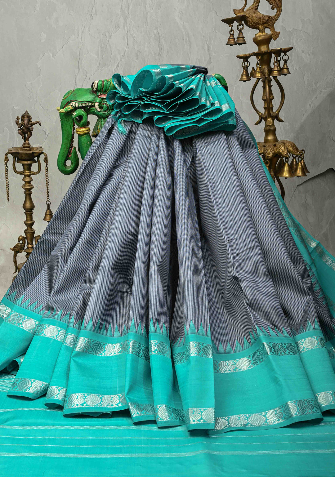 Traditional motifs like temples, checks, florals, and peacocks are woven into the fabric, symbolizing cultural heritage.