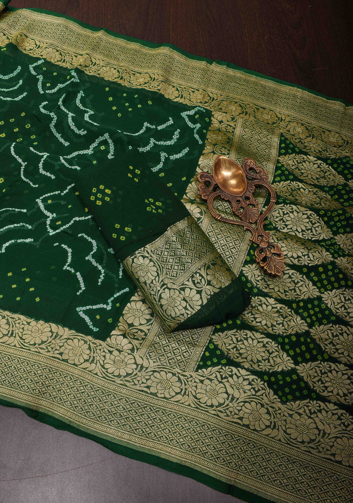 The emerald green Sarkam Bandhni on Banarasi will help you create an impact on any occasion quite effortlessly. The precious Sarkam Bandhini technique is both artistic and mathematical. The technique involves intricately placing thousand of dots and hand knotting, pinching, and resist-dying them to create figurative patterns. Dip-dying them in a bouquet of colors gives them myriad patterns making each drape a unique expression of art.