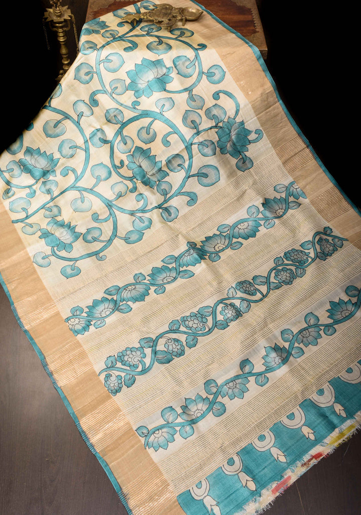 This Beige Jari Tussar Saree is a perfect blend of tradition and elegance, featuring hand-painted Kalamkari floral vines that gracefully adorn the fabric. The delicate artwork is complemented by a shimmering zari border, adding a touch of luxury to the piece.