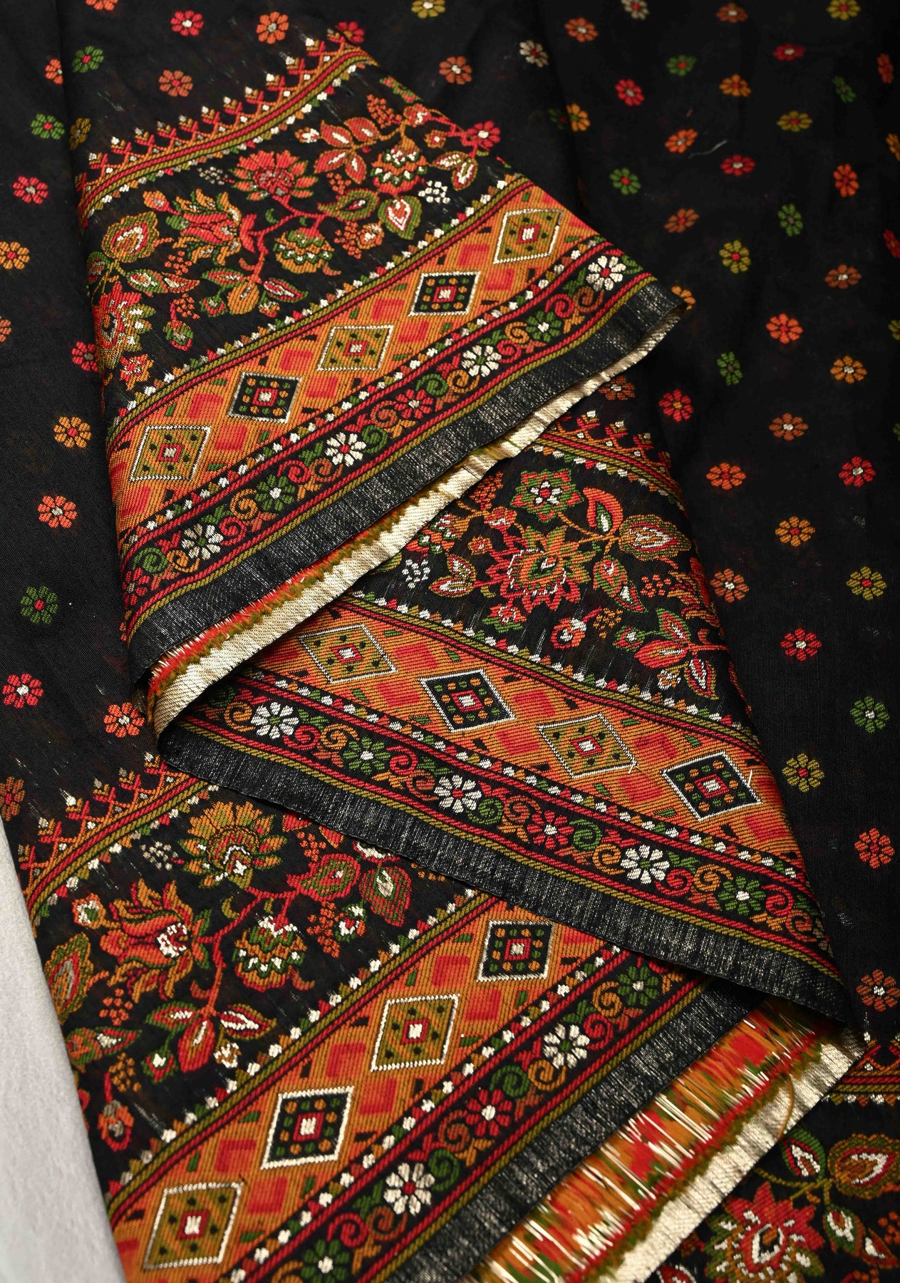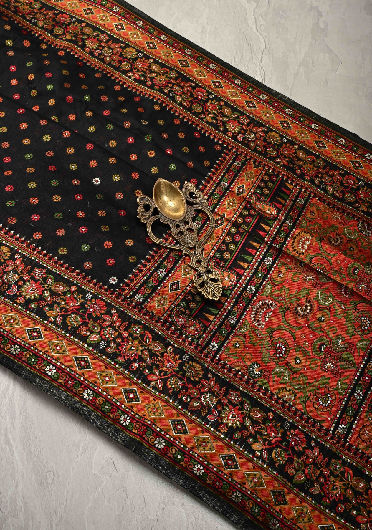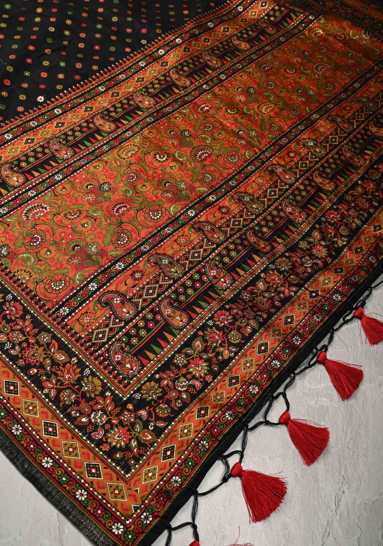The body of the saree is adorned with Meenakari Chunri buttis – delicate, colorful motifs inspired by the age-old Meenakari craft, adding a vibrant touch to the classic black base. These intricate buttis are carefully spaced, lending the saree a rich yet understated appeal.