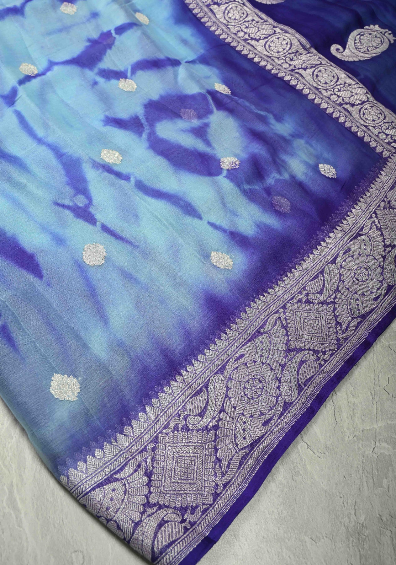 Experience the allure of tradition with a contemporary twist in this captivating Blue Banarasi Shibori Chiffon Silk Saree. Crafted from lightweight chiffon silk, the saree features a mesmerizing Shibori dye pattern, blending beautifully with the soft, flowing texture for a modern yet ethnic appeal.