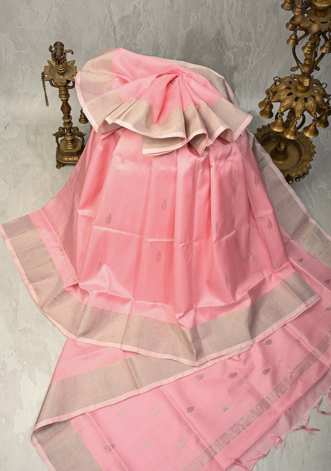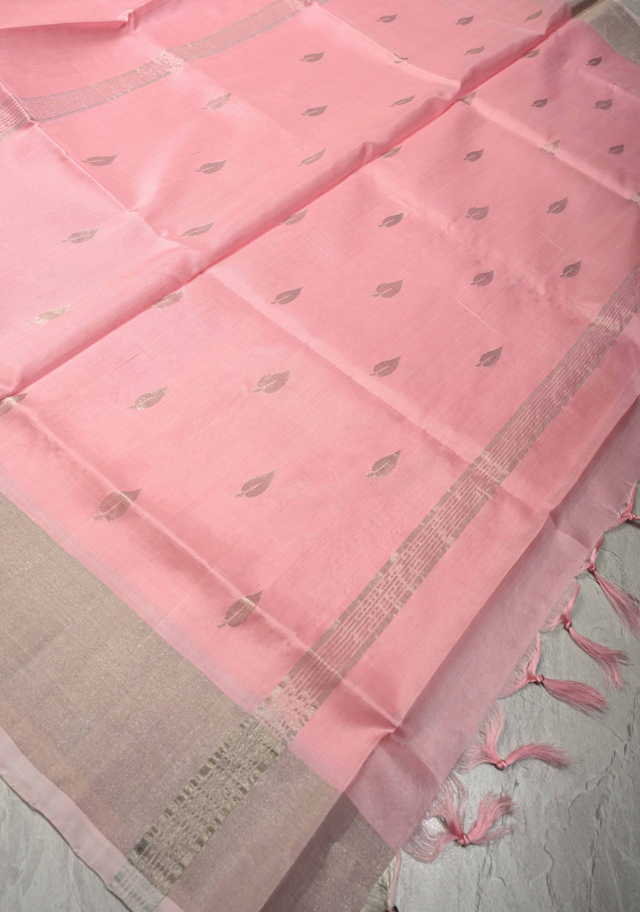 Bring vibrant elegance to your wardrobe with this Bubblegum Pink Uppada Handloom Silk Saree, beautifully handcrafted to showcase traditional South Indian artistry. Woven from fine Uppada silk, the saree features delicate silver zari buttas, adding subtle shimmer and intricate detailing. The tissue border enhances its graceful appeal, giving a soft and luxurious finish. Lightweight and fluidly draped, this saree is perfect for weddings, festive occasions, and daytime celebrations. Pair it with minimal or silver-toned jewelry for a charming, contemporary look.