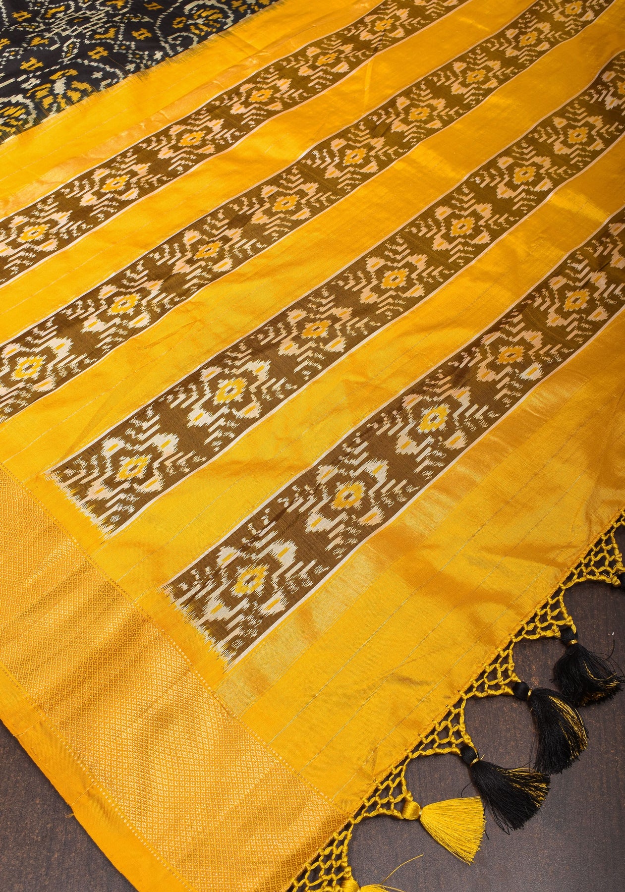 Crafted from luxurious pure Pochampally silk, this saree exudes a rich texture and a lustrous sheen that adds to its allure. The deep black hue of the saree lends it a timeless elegance, making it a versatile choice for various occasions.