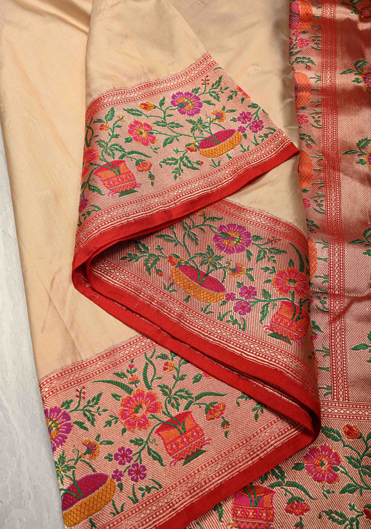 The serene cream body is adorned with delicate floral zari buttas, intricately woven to add a subtle shimmer and traditional charm. The striking contrast Paithani border brings a burst of vibrant colors and intricate motifs, creating a stunning juxtaposition that enhances the saree’s overall appeal.