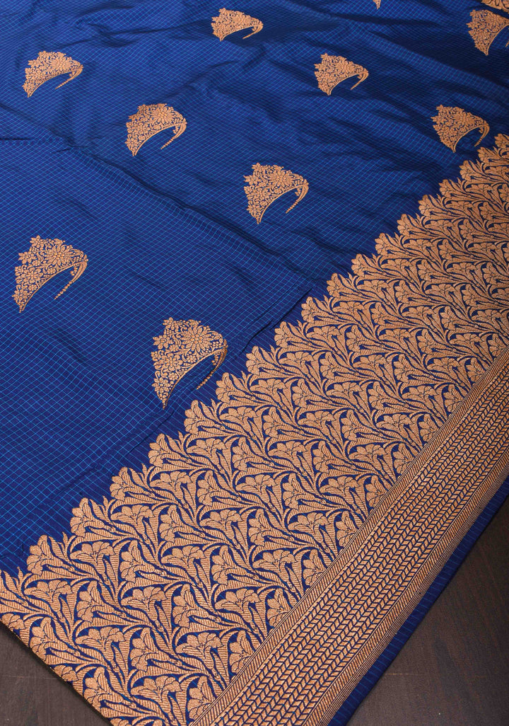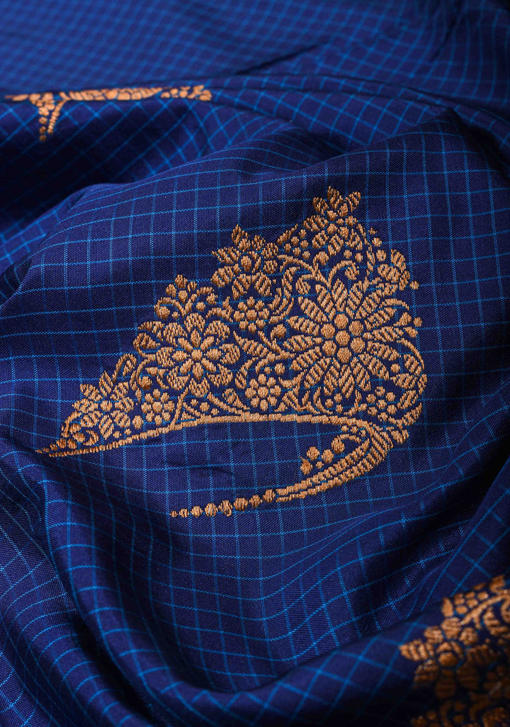 This Dark Blue Checks Banarasi Katan Silk Saree is a stunning blend of traditional charm and modern design. The dark blue fabric features a classic checkered pattern, adding a sophisticated texture to the saree. The tiara motifs intricately woven with zari threads, enhance the saree’s grandeur, giving it a regal and elegant touch. Made from Katan silk, this saree drapes gracefully, offering both comfort and beauty. Ideal for weddings, festivals, or special occasions, this saree is the perfect choice for those seeking a timeless piece with intricate craftsmanship and luxurious appeal.