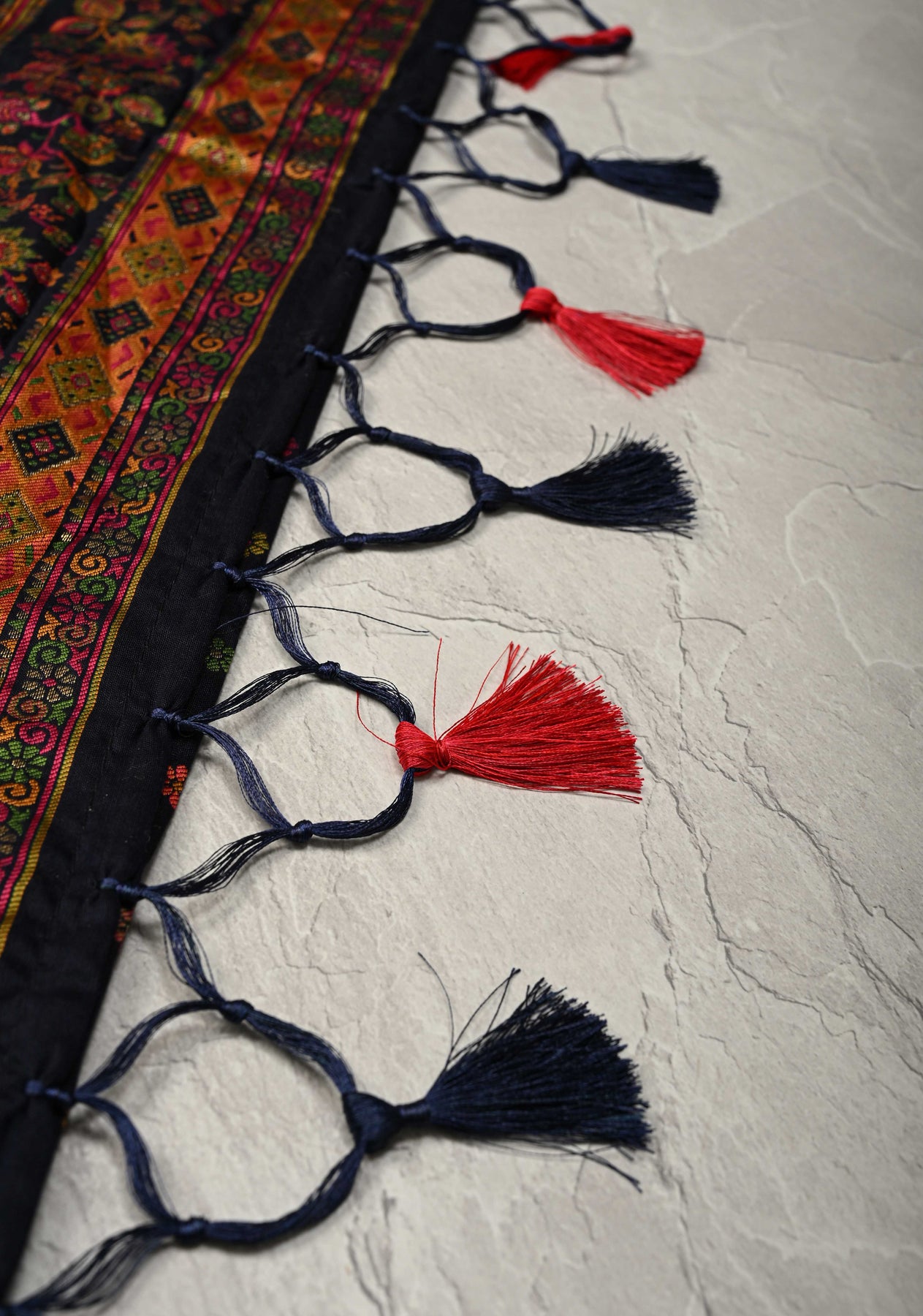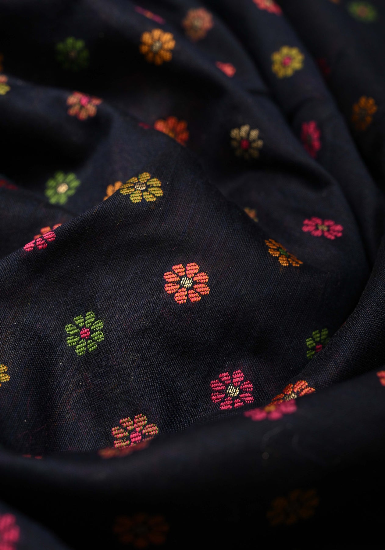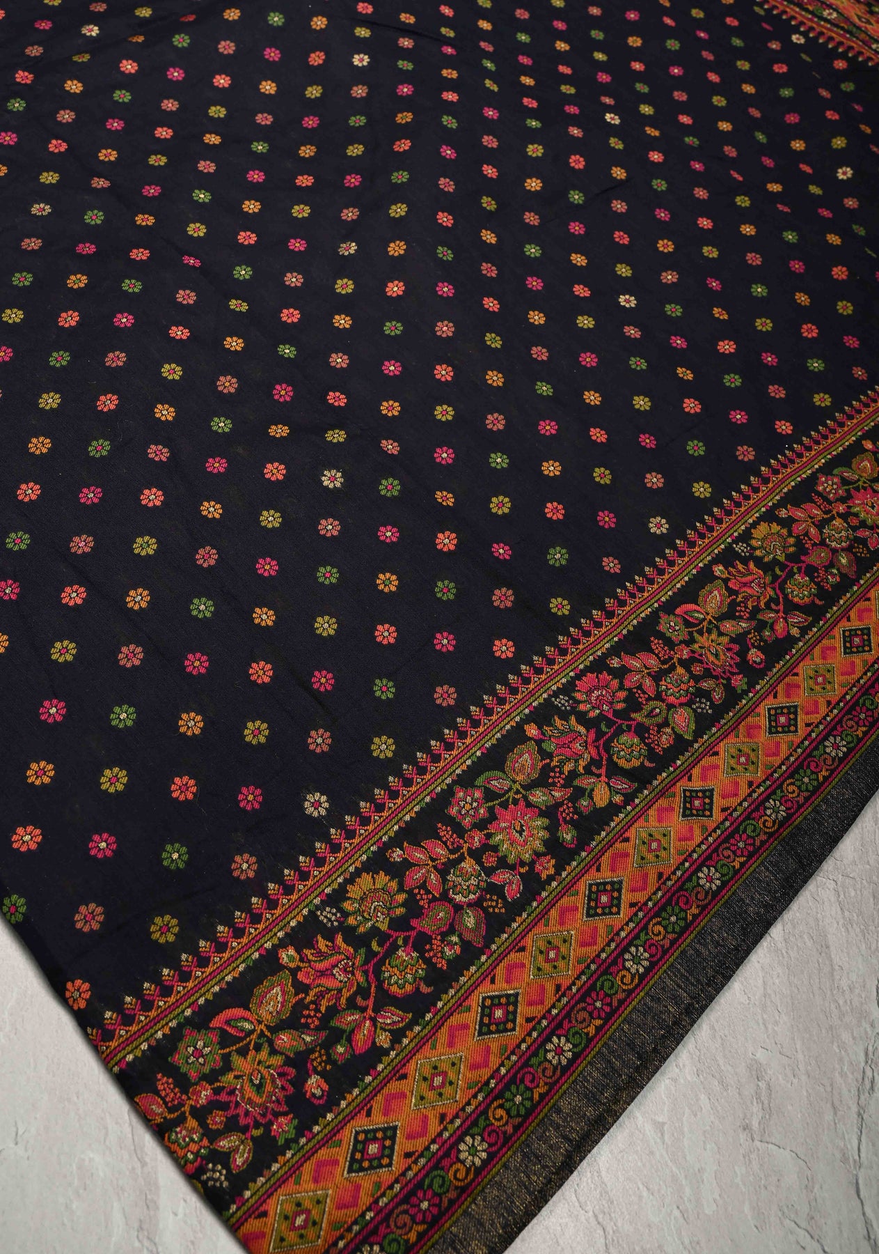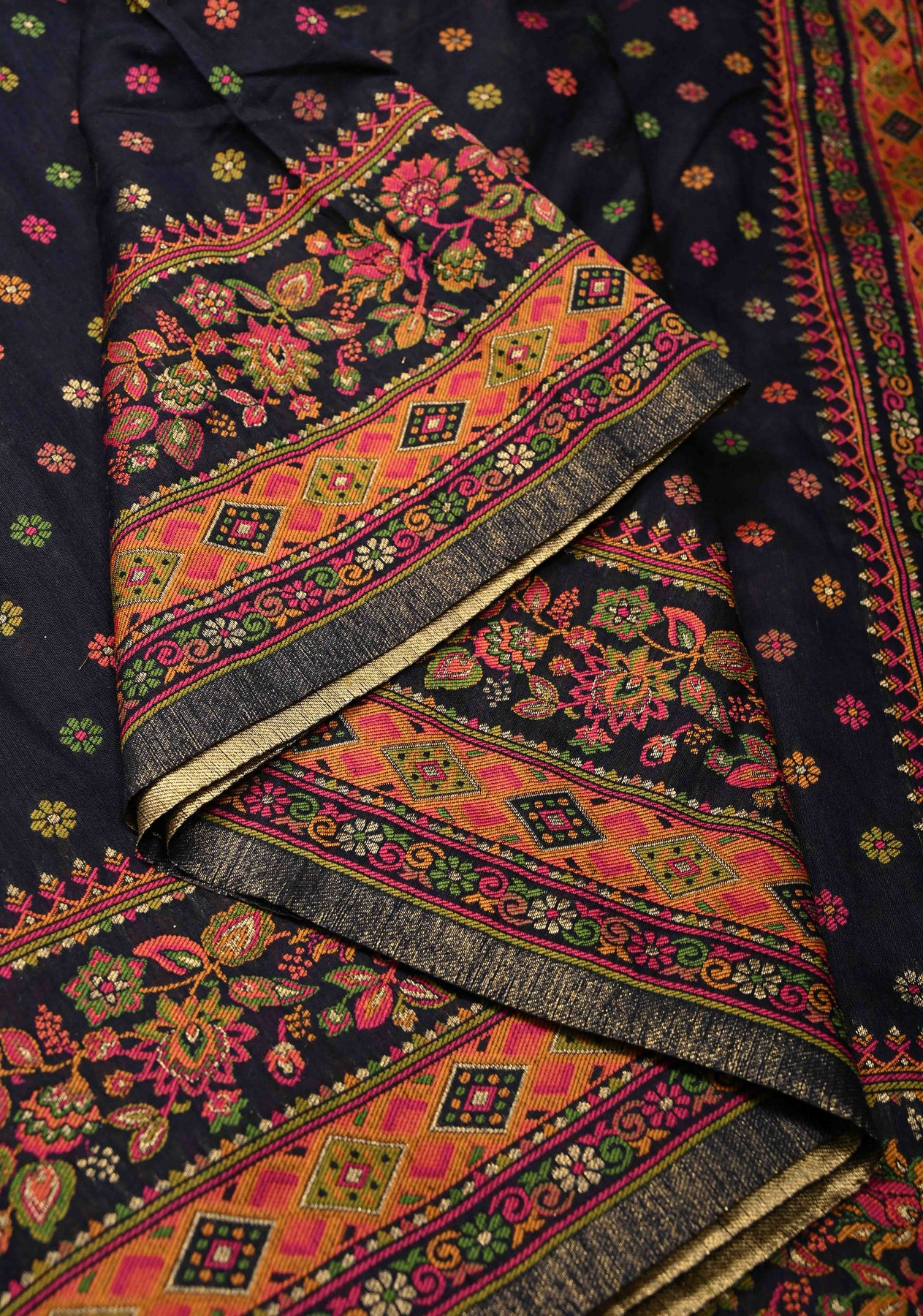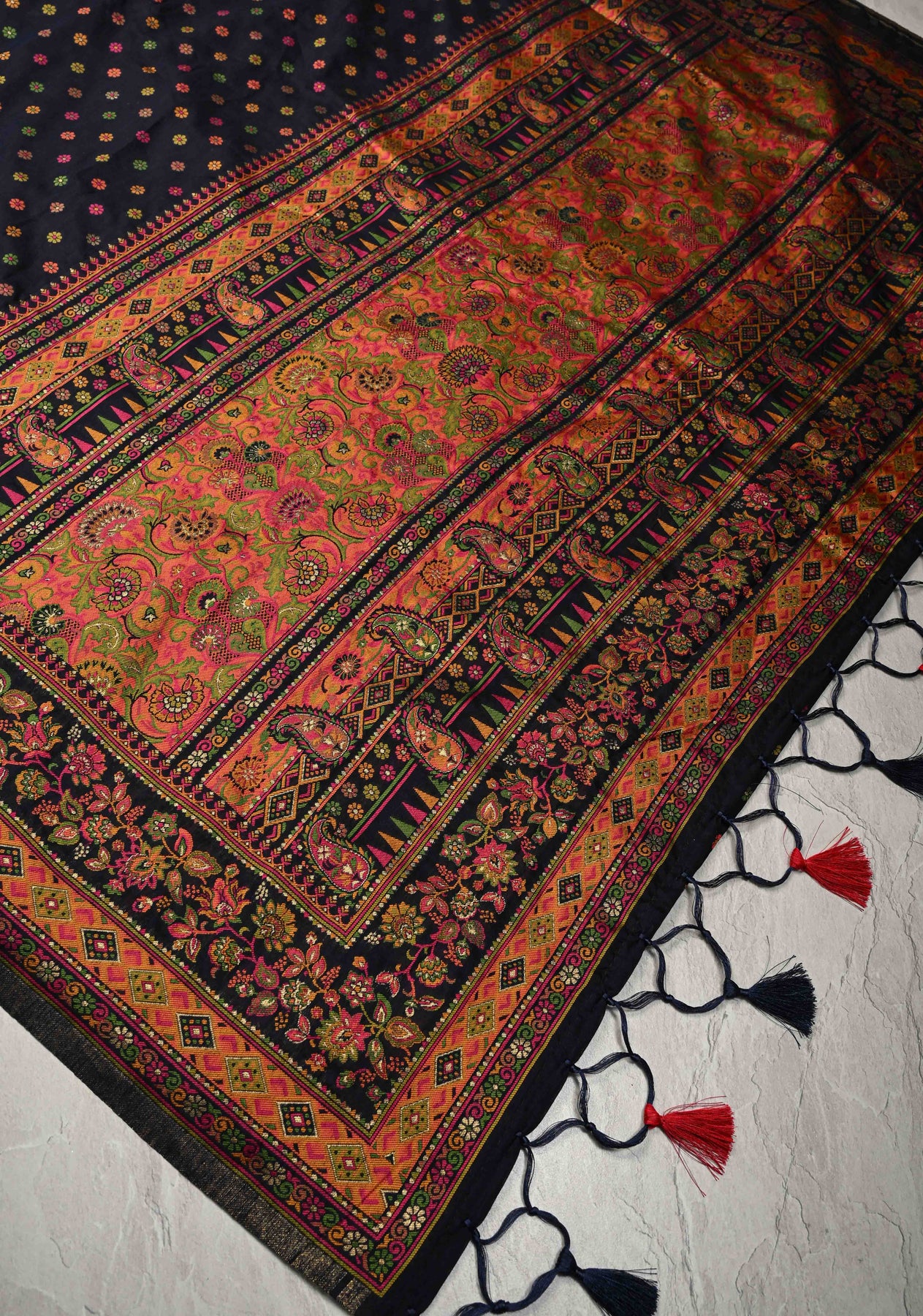 Drape yourself in elegance with this stunning Black Rayon Saree, featuring intricate Meenakari Chunri buttis that bring a traditional Rajasthani touch to the design. Crafted from soft, flowy rayon fabric, the saree offers a graceful fall and all-day comfort. The highlight is its exquisite Kani design, inspired by rich Kashmiri weaving patterns, adding depth and sophistication to the overall look. Ideal for festive occasions, family gatherings, or cultural events, this saree combines traditional charm with modern appeal for a truly timeless ensemble.