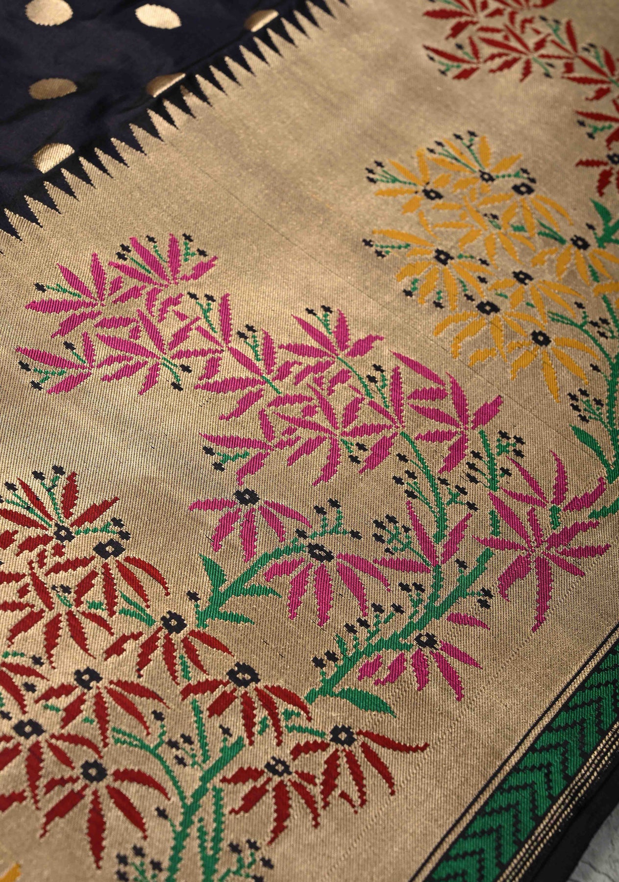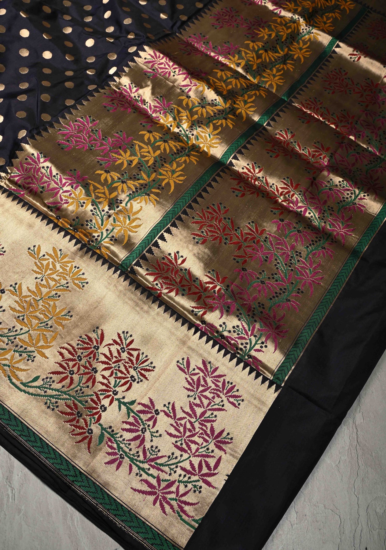 Exquisite Midnight Blue Banarasi Katan Silk Saree with Polka Dot Brocade and Paithani Style Meenakari Wide Zari Border | SILK MARK CERTIFIED
