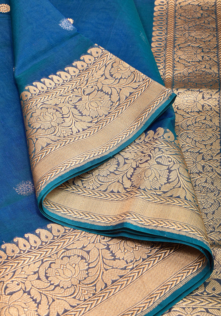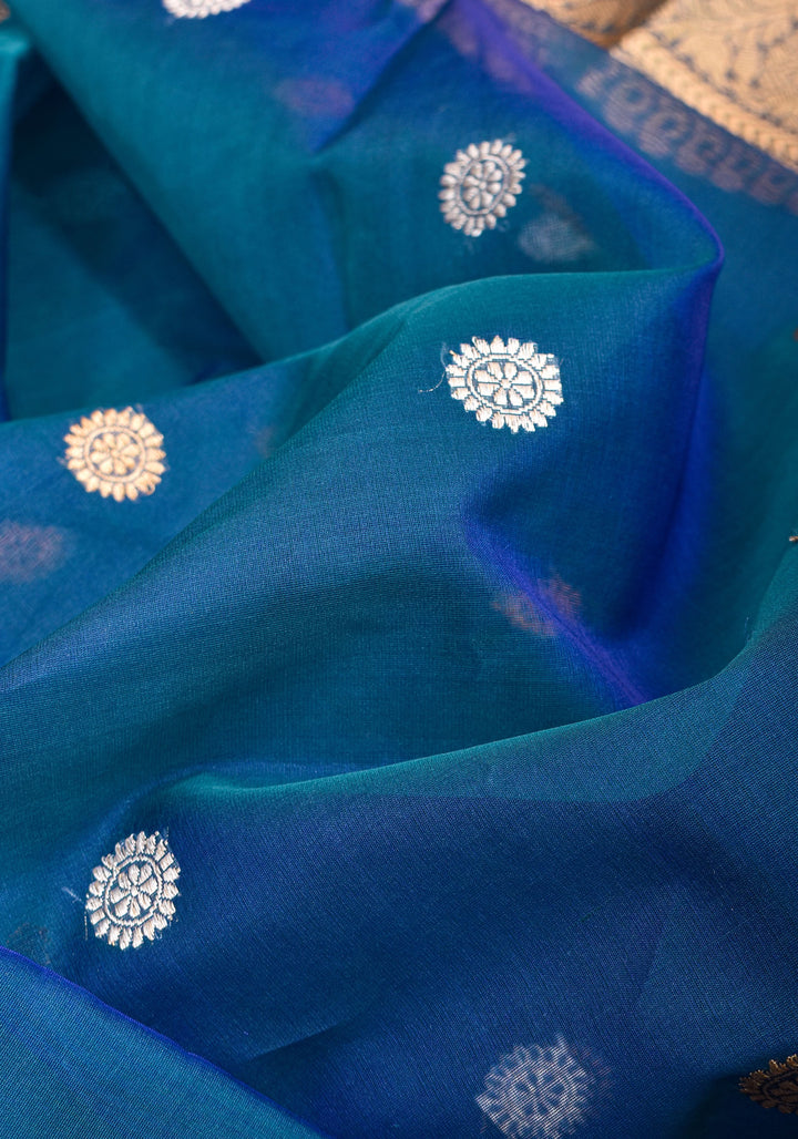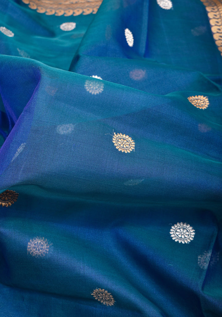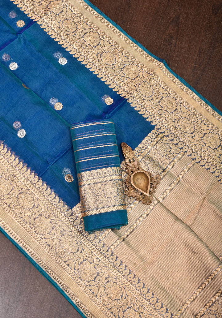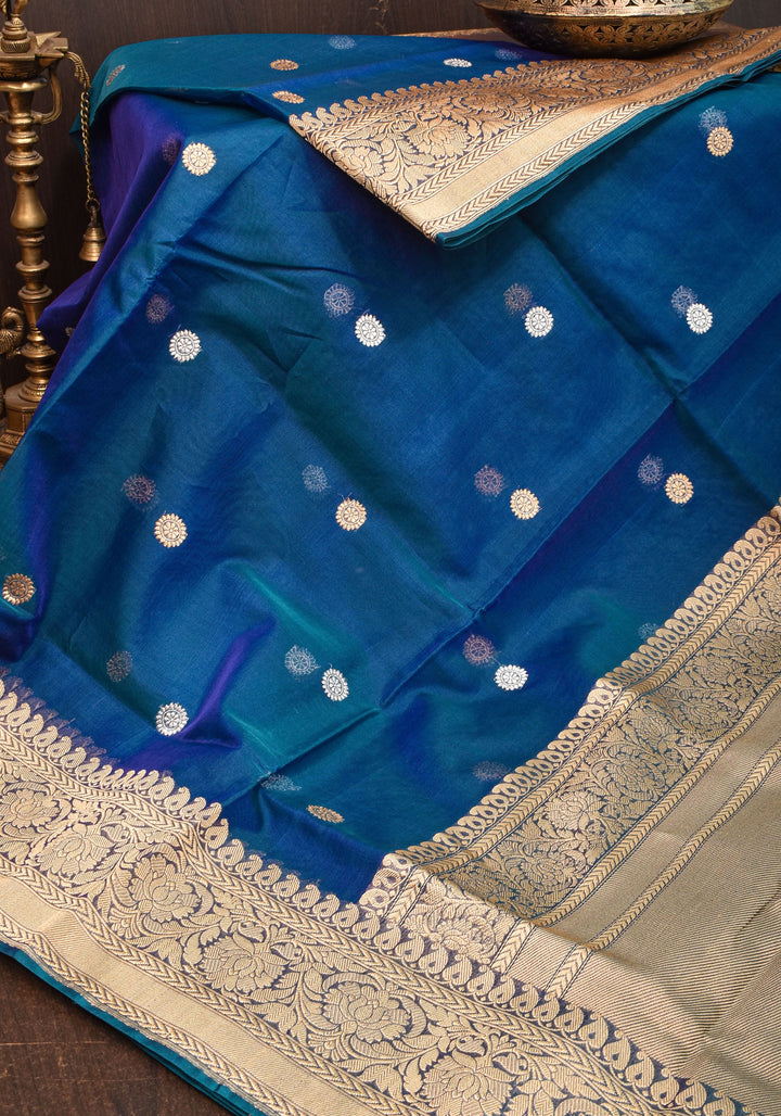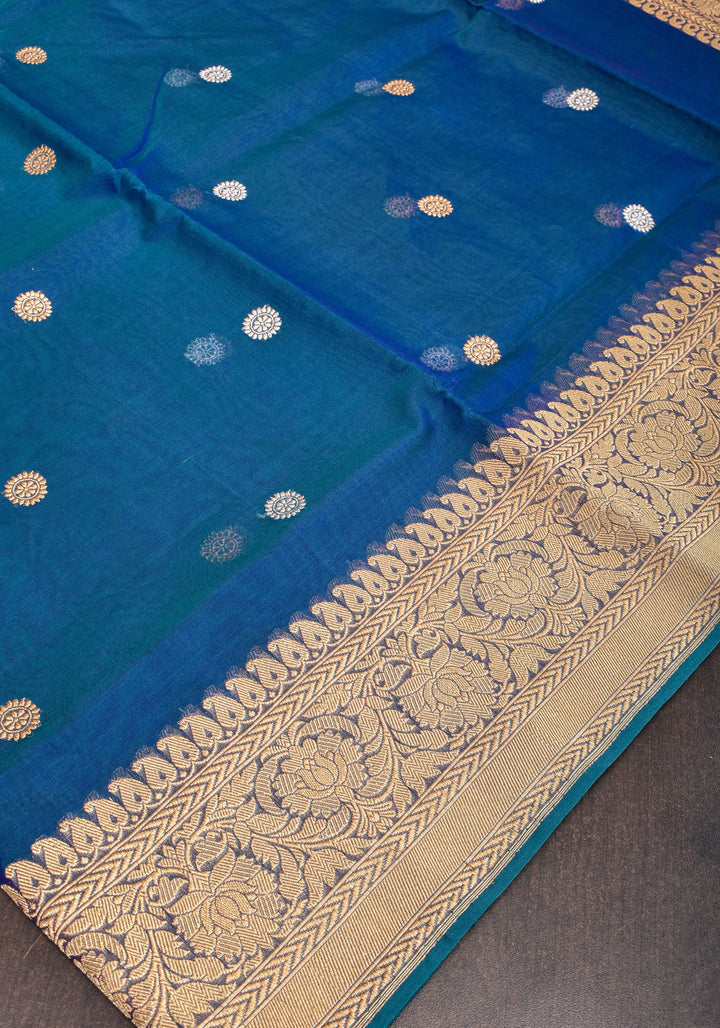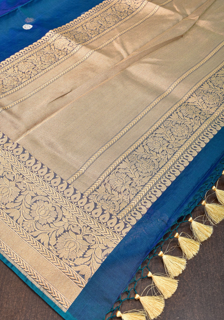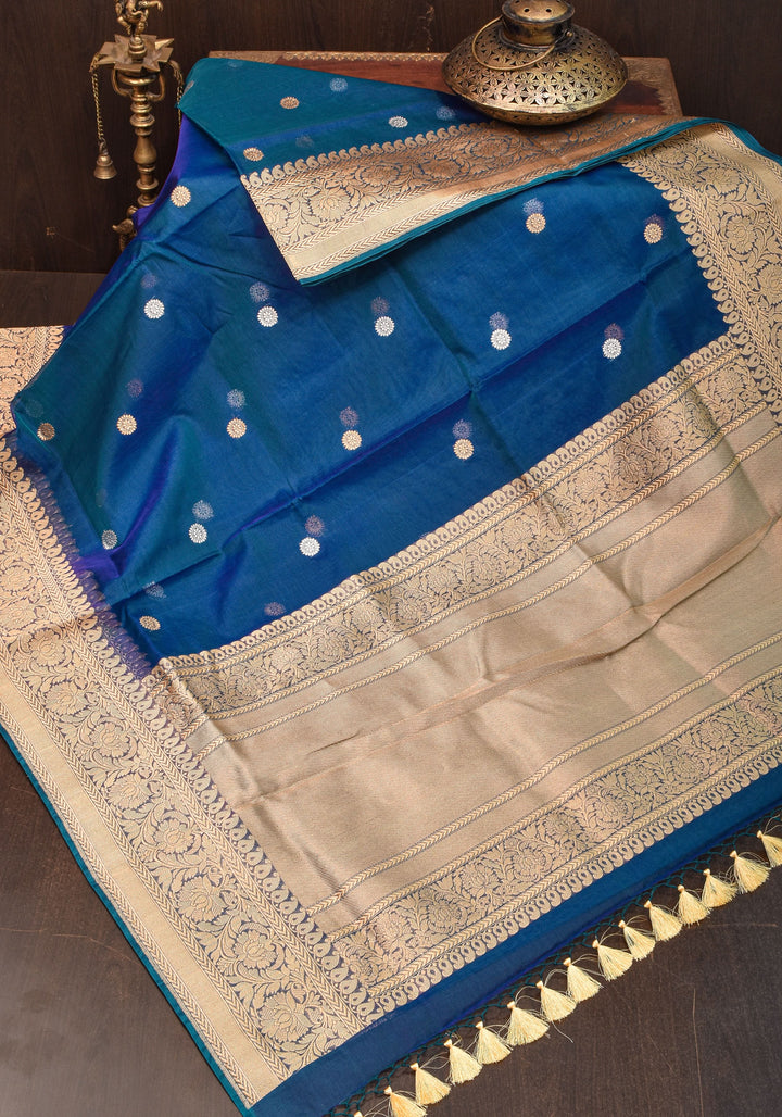 Elegant and timeless, the Exquisite Pure Banarasi Kora Silk Saree in Prussian Blue Dual Tone offers a luxurious feel with its intricate Sona Rupa Buttas and stunning Zari border. Perfect for special occasions, this saree combines traditional craftsmanship with modern sophistication, making it a must-have addition to your wardrobe