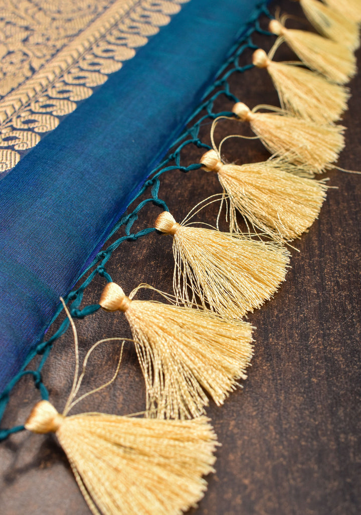 This saree is ready to wear with fall and pico done. Handmade silk tassels adorn the pallu and add more grace to it. An unstitched blouse fabric is included.