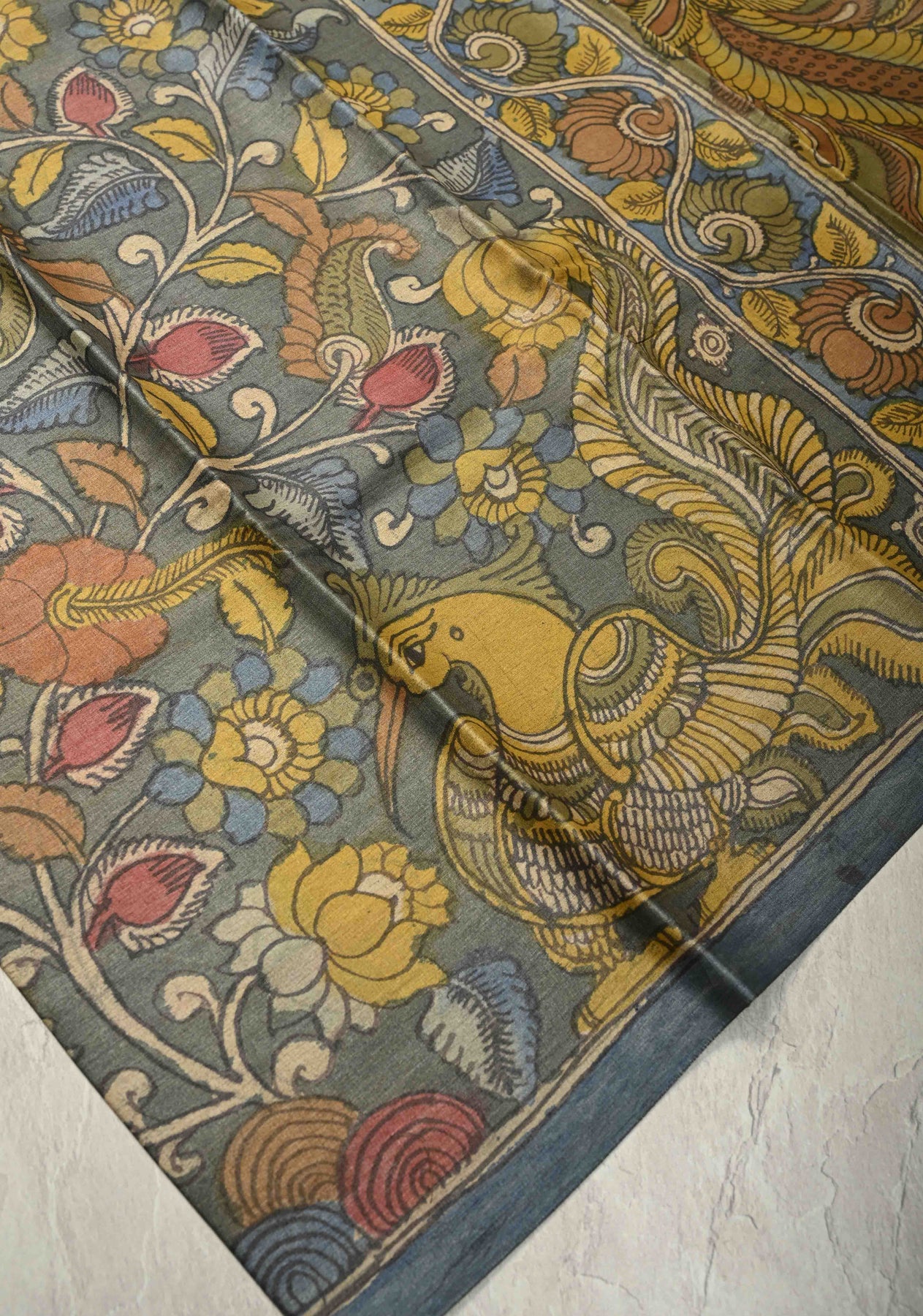 This gray pure Tussar silk saree showcases the elegance of authentic Pen Kalamkari artistry, featuring intricate peacock and floral motifs. Hand-painted with precision, the design highlights traditional craftsmanship while complementing the soft, textured Tussar silk base. The subtle gray shade enhances the vibrancy of the detailed Kalamkari work, creating a sophisticated and timeless look. With its lightweight drape and natural sheen, this saree is perfect for weddings, festive celebrations, and cultural events. A beautiful fusion of heritage art and modern elegance, it makes a striking statement for any special occasion.