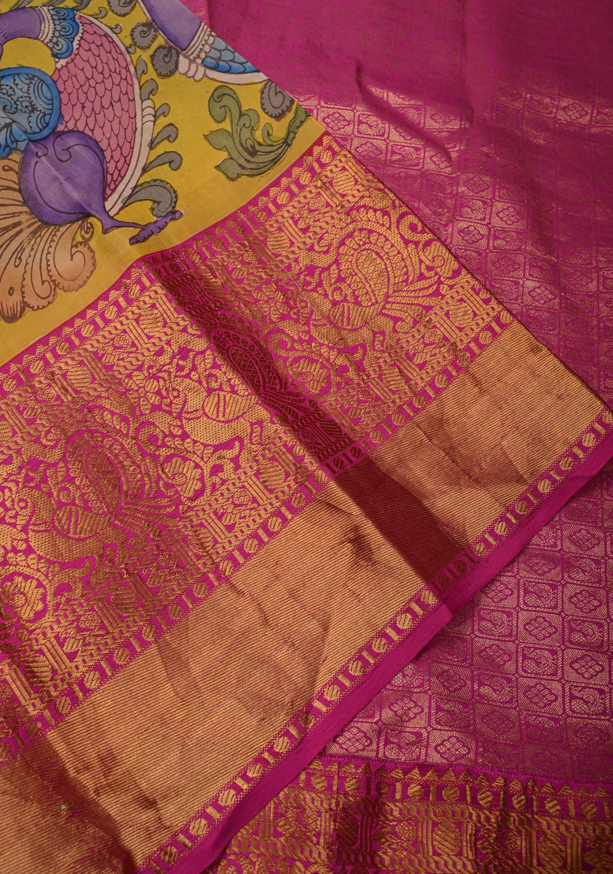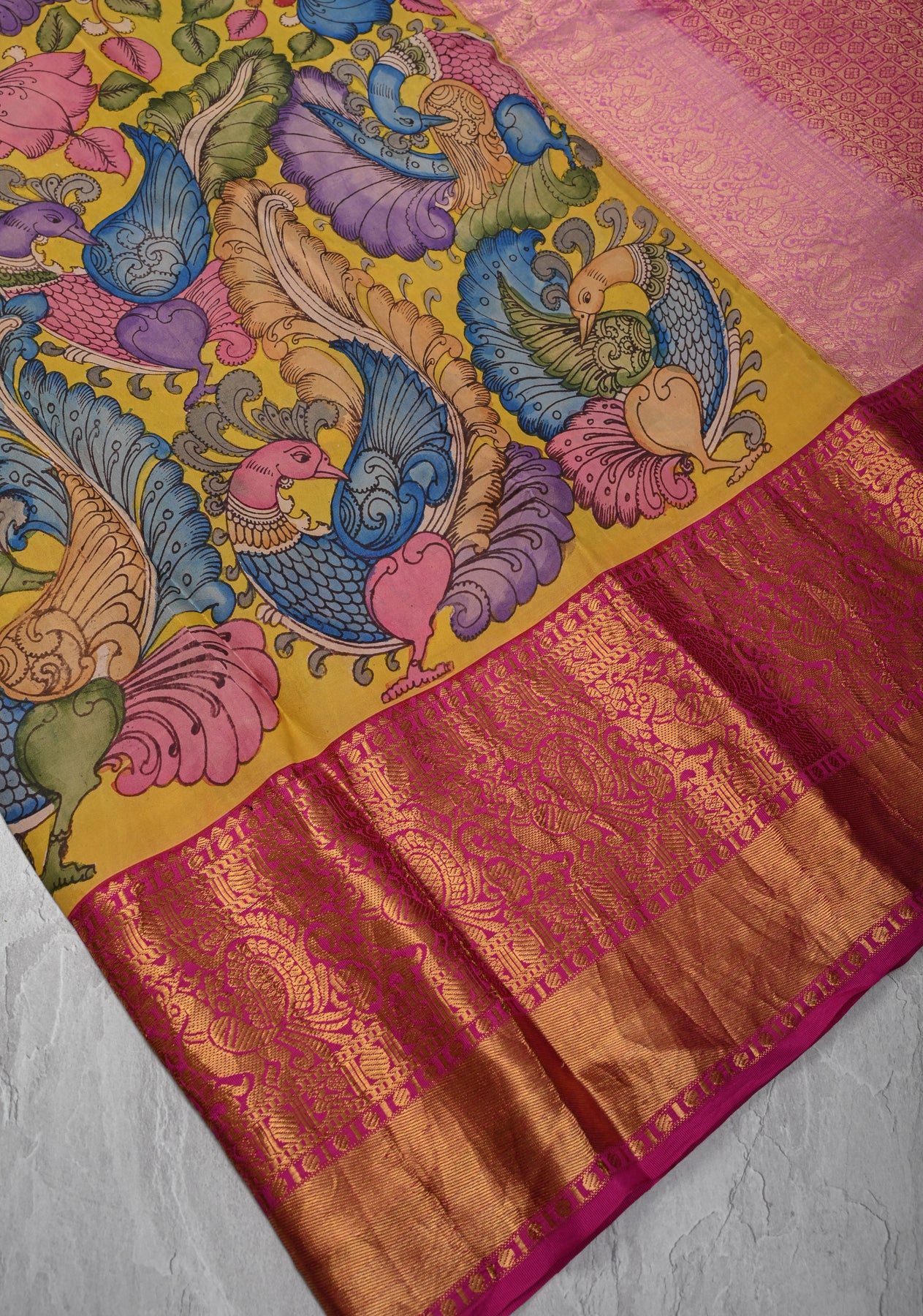 Radiating warmth and tradition, this Yellow Authentic Pen Kalamkari Kanjivaram Silk Saree is a striking statement of heritage artistry. The vibrant yellow base is beautifully hand-embellished with intricate pen kalamkari motifs, meticulously drawn using natural dyes that bring cultural stories to life. Crafted from luxurious Kanjivaram silk, the saree features a lustrous finish and is enhanced with an opulent zari border, adding grandeur to its timeless appeal. Ideal for festive occasions, weddings, and cultural events, this saree blends tradition, craftsmanship, and elegance in every drape