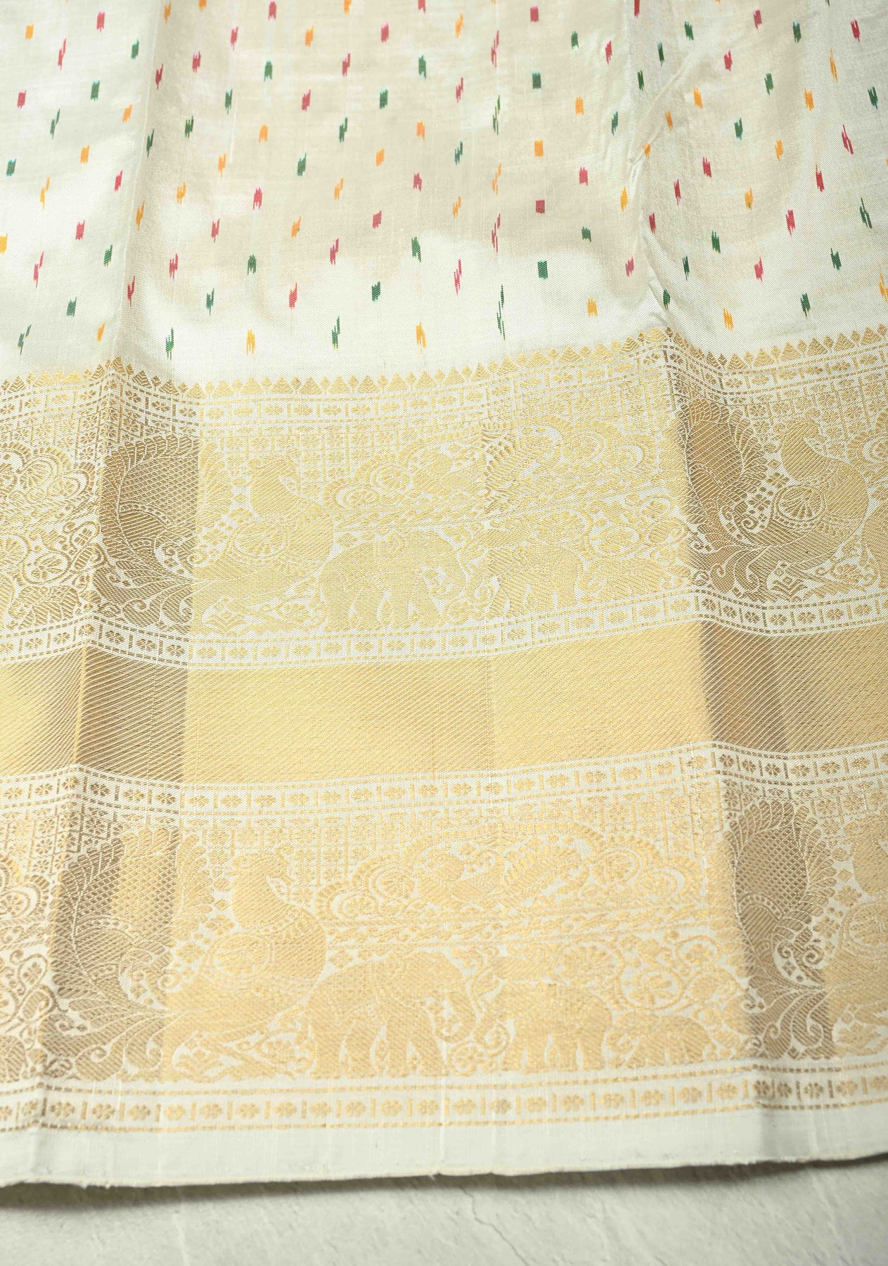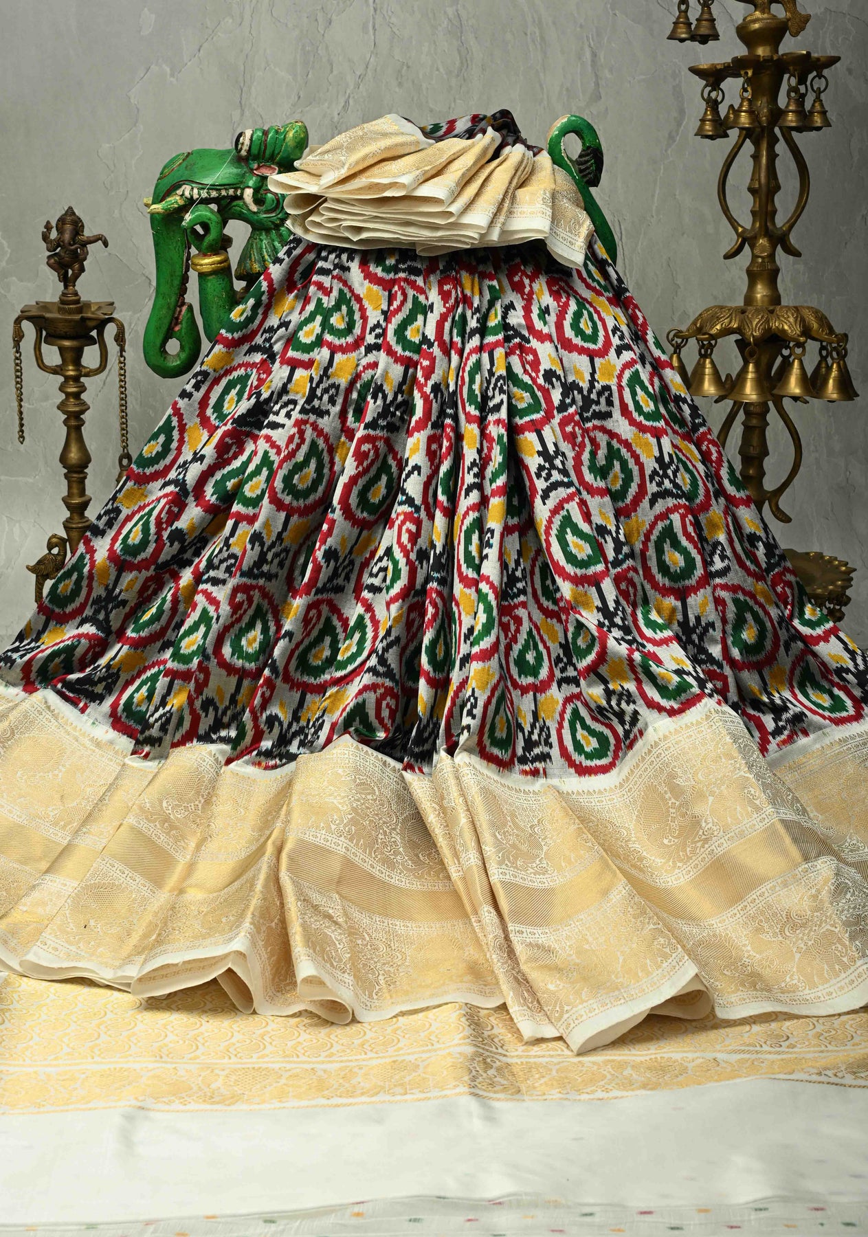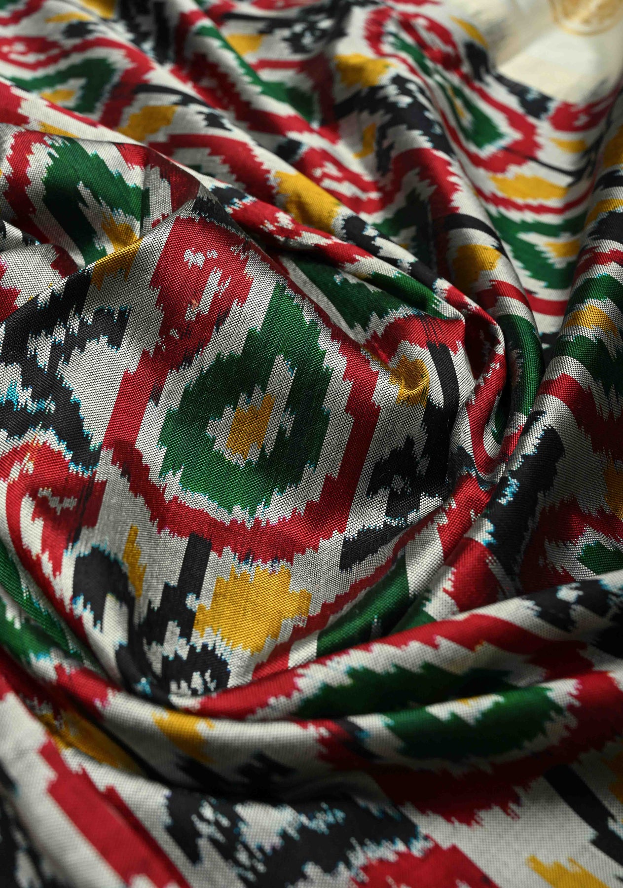 The saree features an eye-catching Ikkat design across its body, providing a unique and stylish aesthetic. A contrast wide zari border adds depth, vibrance, and regal elegance, highlighting the fusion of traditional and contemporary elements.