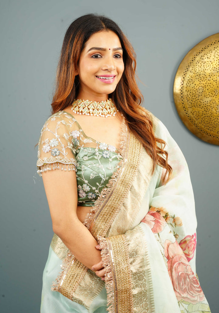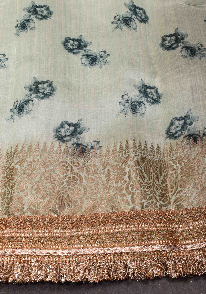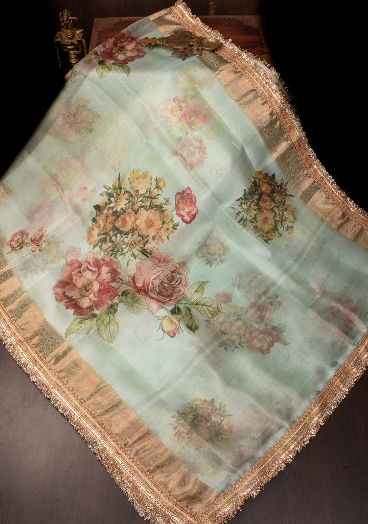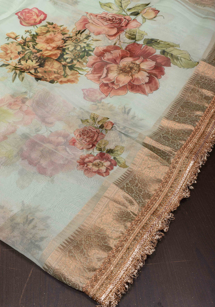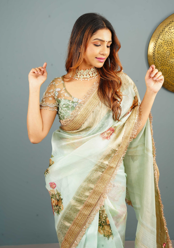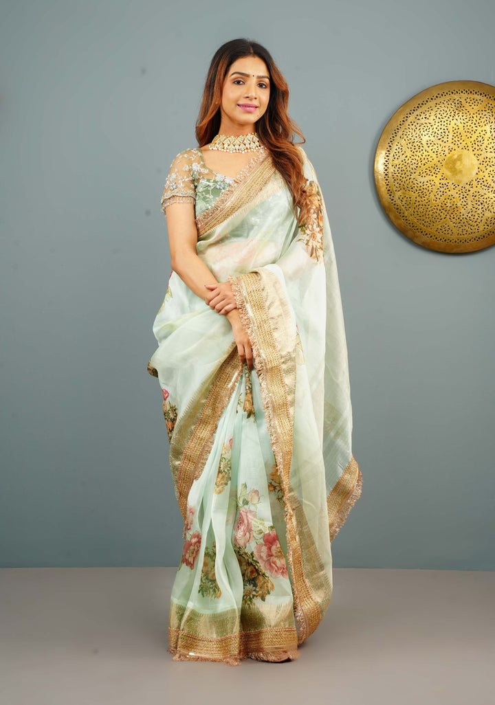 This Light Mint Green Pure Organza Silk Saree exudes elegance with its soft, ethereal texture and delicate sheen. The fabric features a beautiful floral digital print in vibrant hues, adding a modern touch to its classic charm.