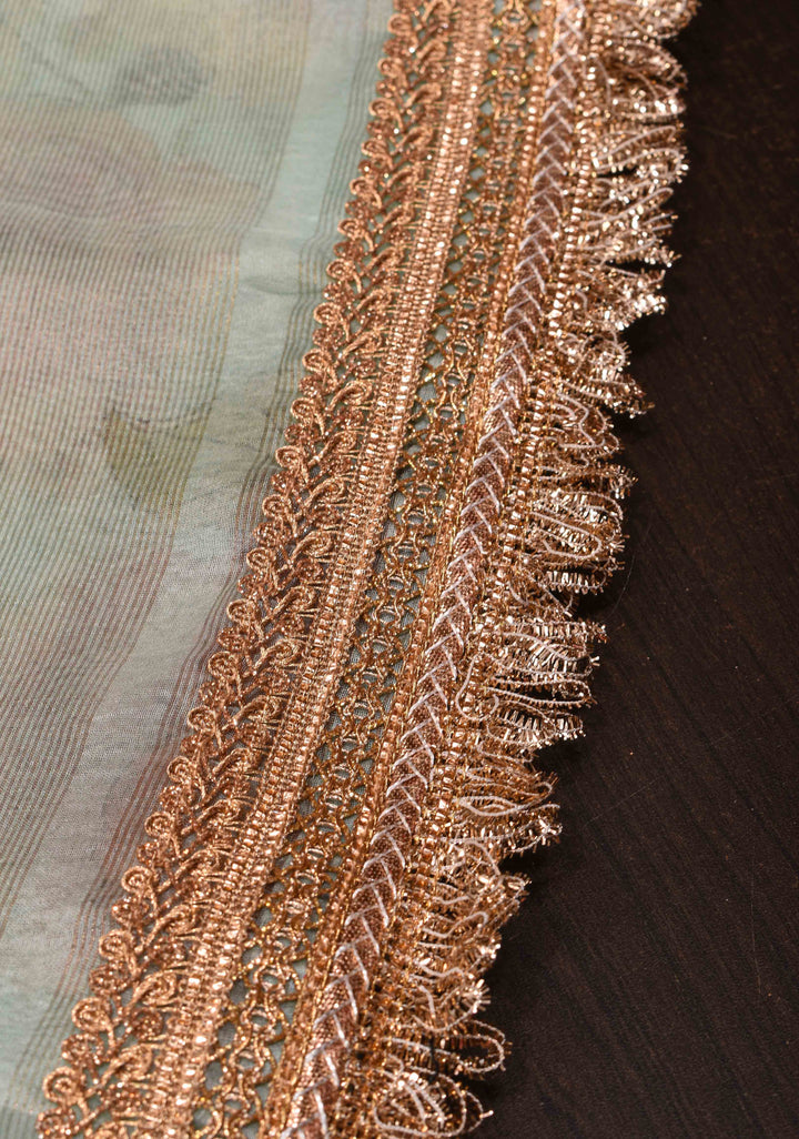 The saree is further enhanced with a finely crafted lace trim border, offering a sophisticated contrast to the soft mint shade. Perfect for special occasions, this saree combines timeless beauty with contemporary style.