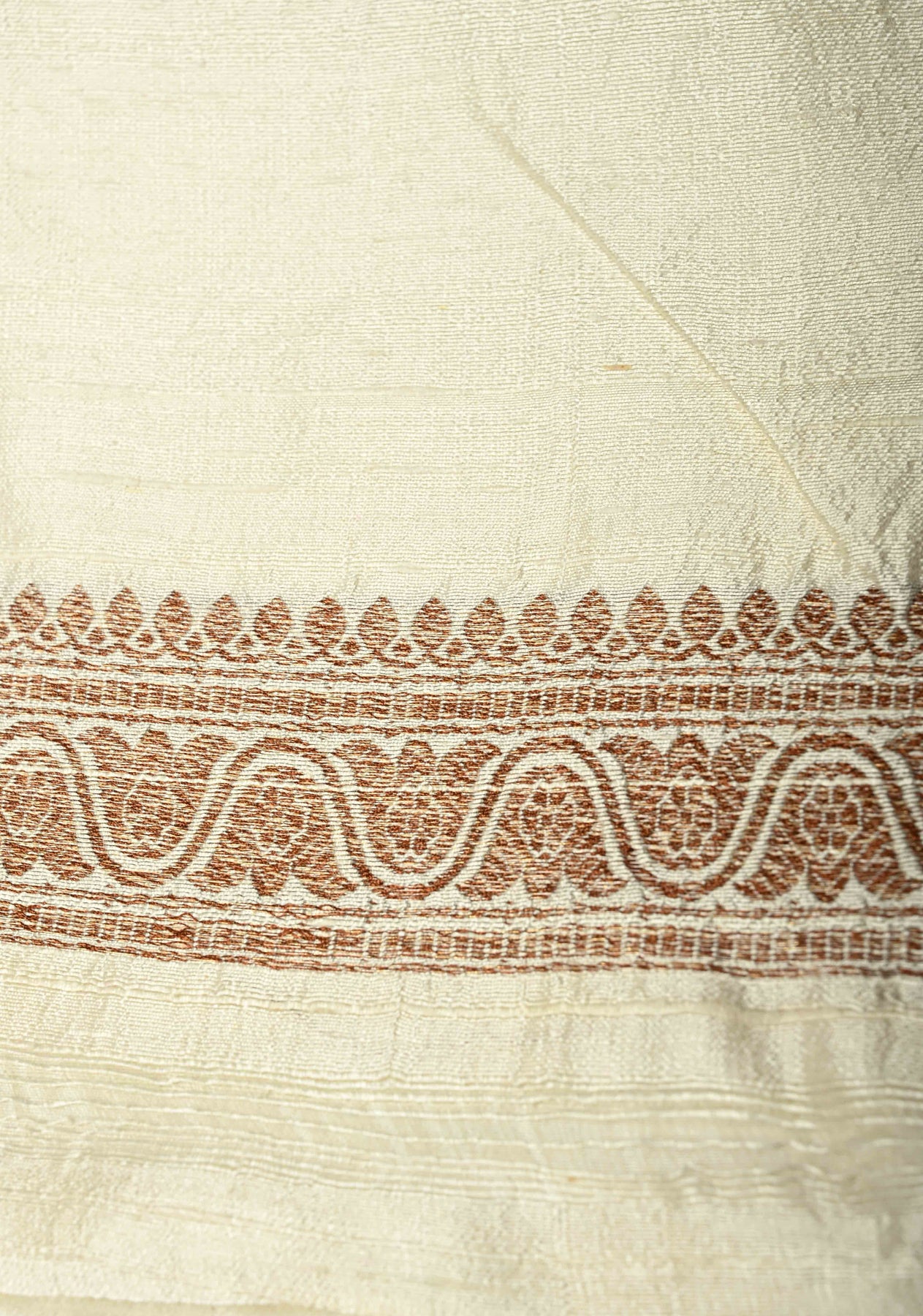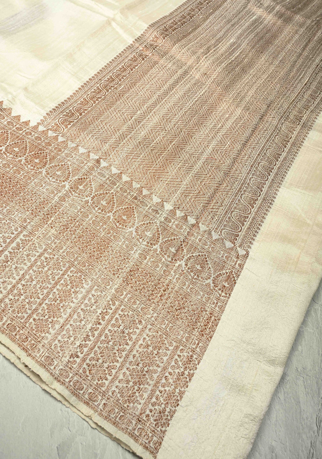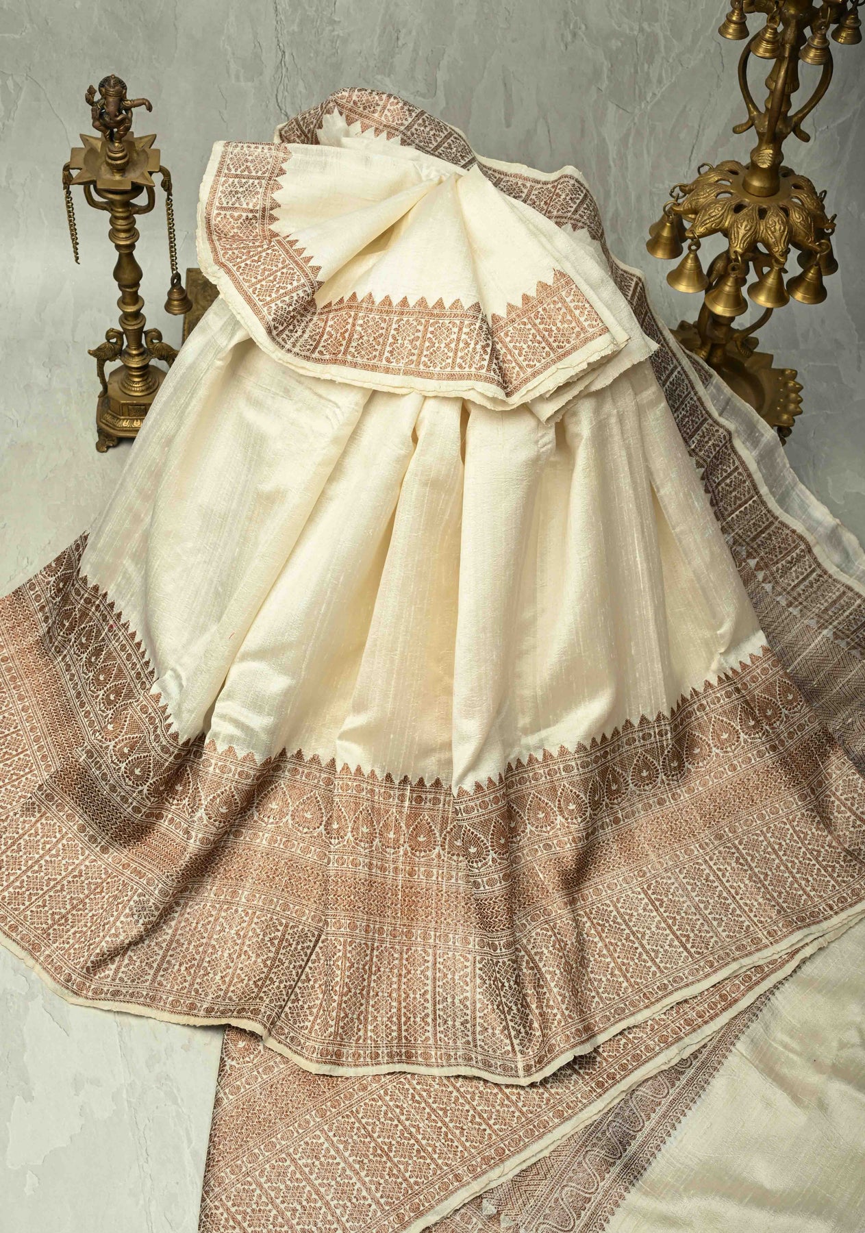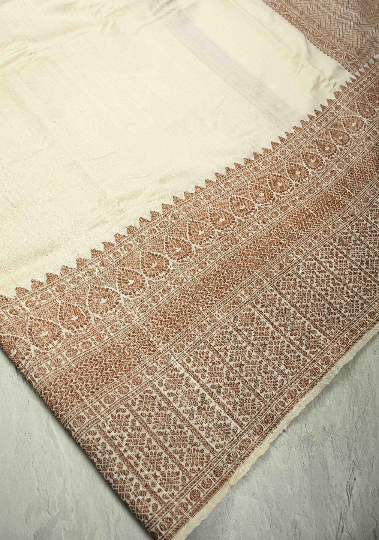 The saree is beautifully accented with an antique Zari border, adding a touch of vintage charm and regal allure. The muted gold tones of the zari perfectly complement the soft ivory hue, making it ideal for both day and evening occasions.