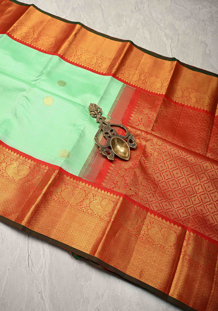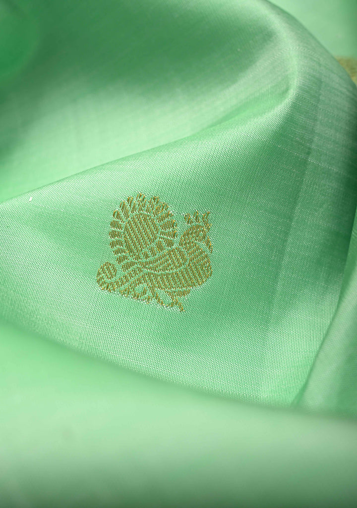 This elegant Light Pista Green Korvai Weave Kanjivaram Pure Silk Saree beautifully blends serene hues with intricate craftsmanship. Woven from pure silk, the saree features a soothing Light Pista green body adorned with delicate zari buttas that add subtle sparkle throughout. The traditional Korvai weave technique enhances the fabric’s texture and richness, while the contrasting zari border provides a striking frame with detailed motifs. Perfect for weddings, festivals, and special occasions, this saree exudes timeless charm and refined elegance.