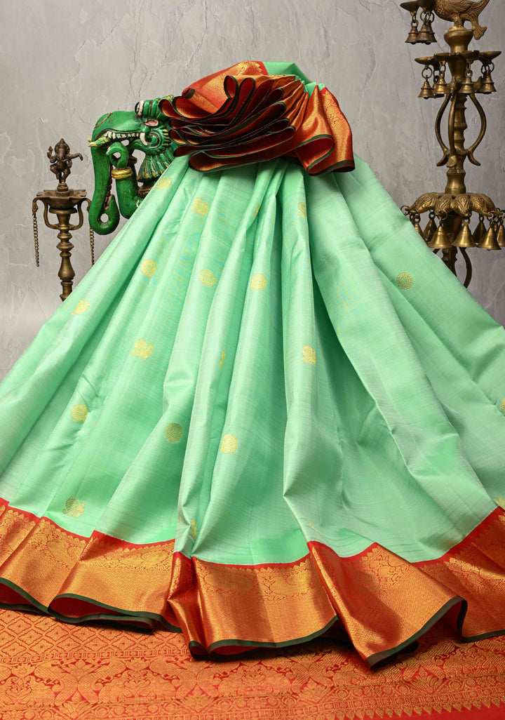 Woven in the iconic Korvai weave, where the body and borders are intricately interlocked, this masterpiece offers a stunning explosion of colors — a true celebration of craftsmanship and tradition.