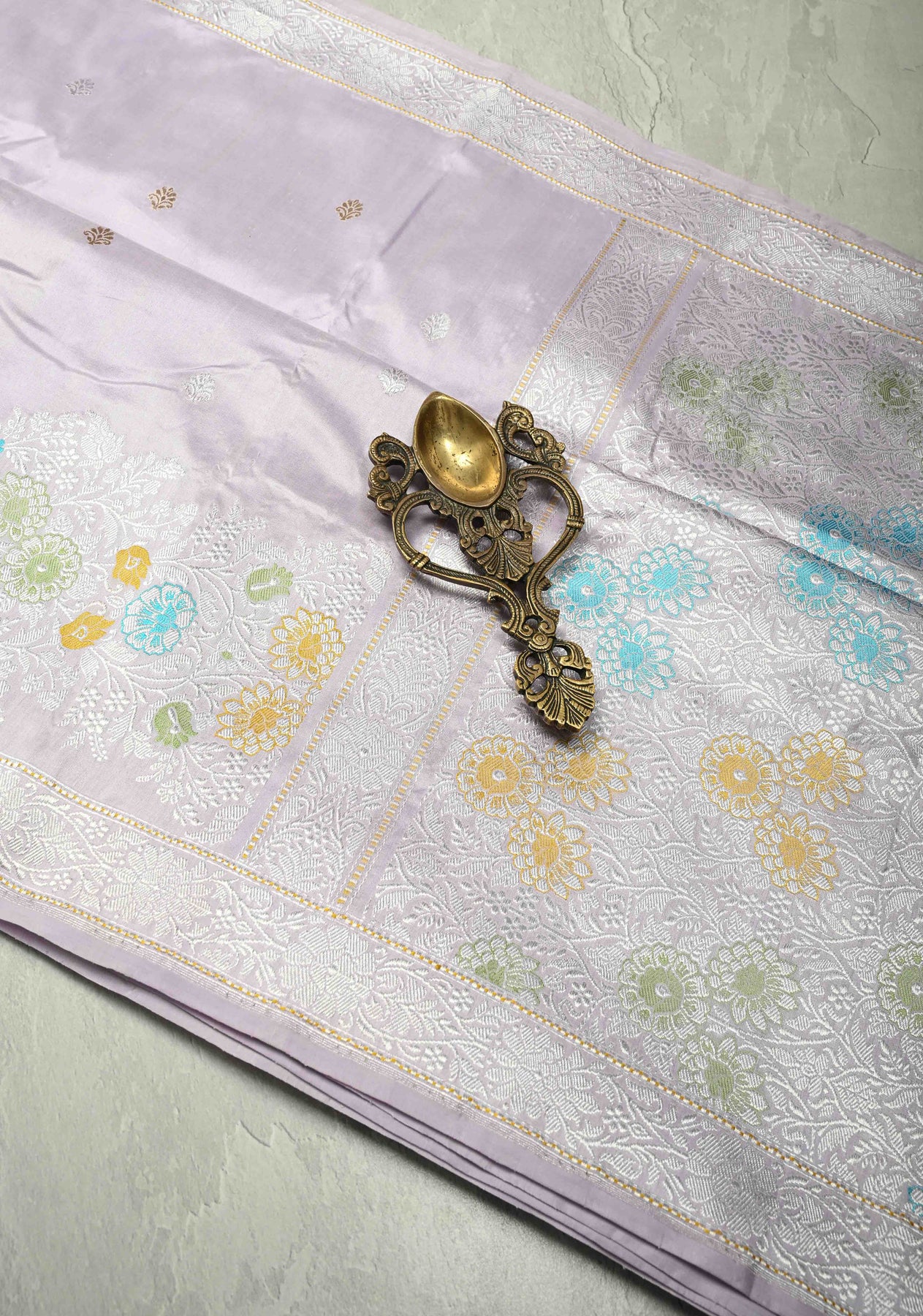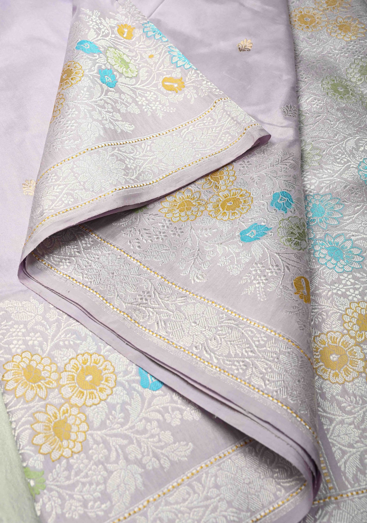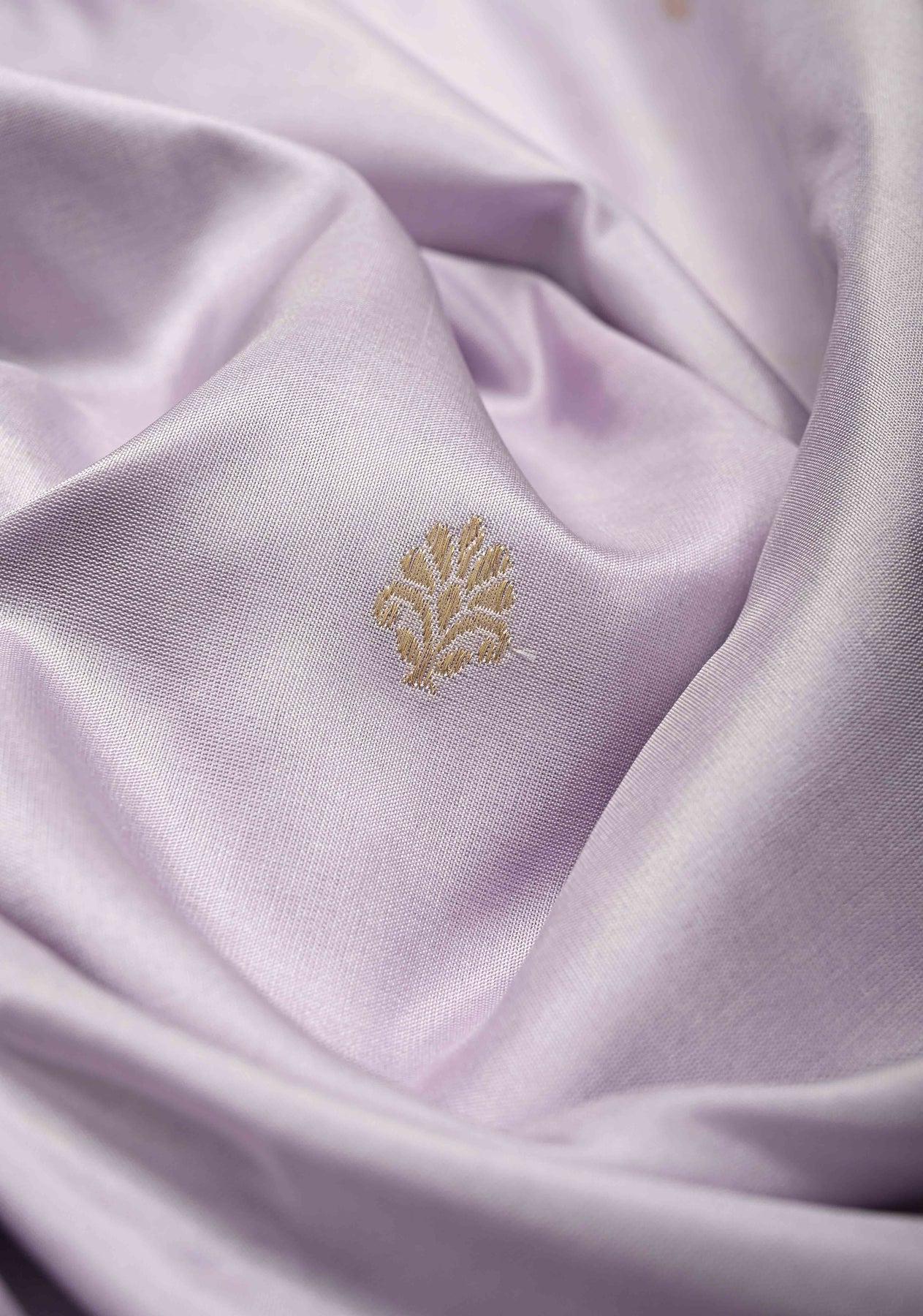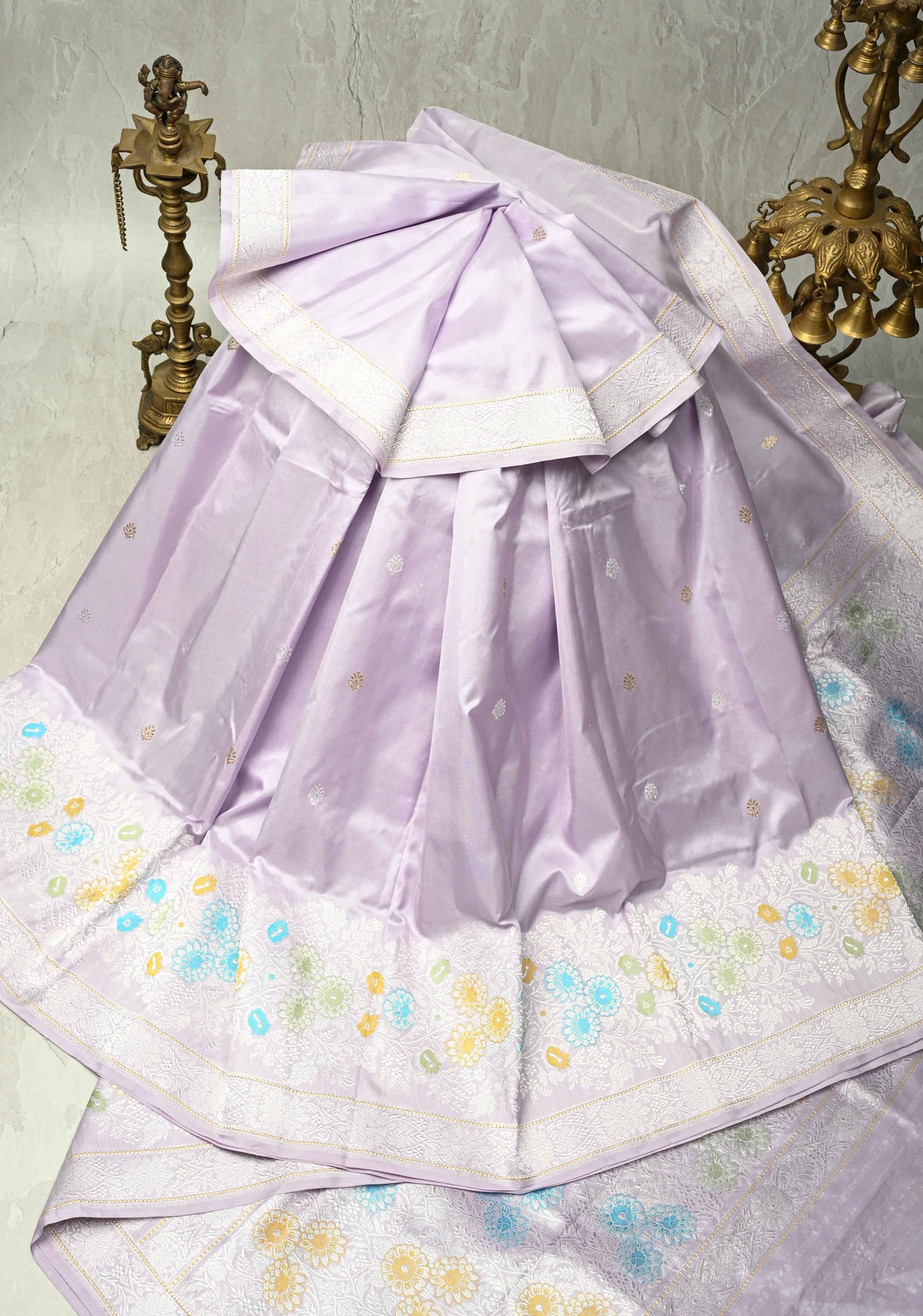 The Kadhuwa Meenakari Skirt Banarasi Pure Katan Silk Saree in Smokey Lavender is a rare blend of heritage craftsmanship and subtle luxury. Woven from the finest pure Katan silk, this saree features the intricate Kadhuwa weave—a labor-intensive technique known for its durability and refined finish. The body is adorned with a rich Jungla Meenakari jaal, showcasing elaborate floral and vine patterns highlighted with multicolored threads that bring the design to life. Accentuated with delicate Sona Rupa Chunri buttis and a shimmering zari border, this saree is a true testament to timeless Banarasi artistry. The soft smokey lavender hue adds an ethereal charm, making it an exquisite choice for weddings, grand celebrations, and heirloom-worthy collections.
