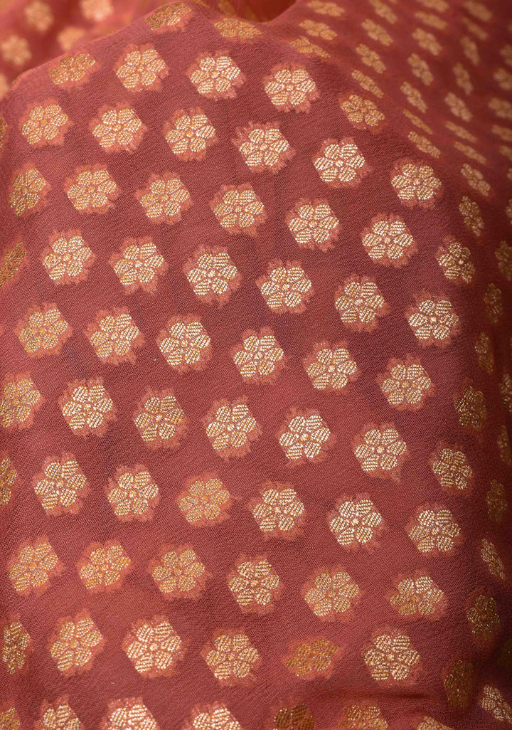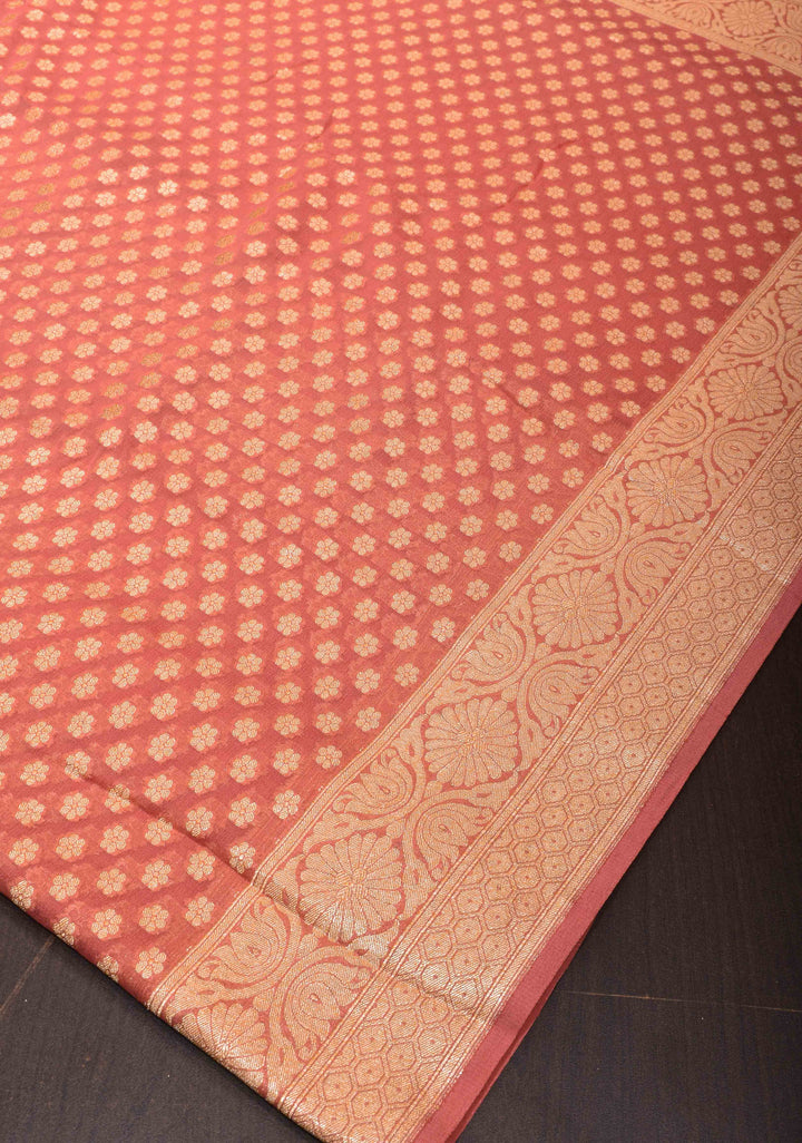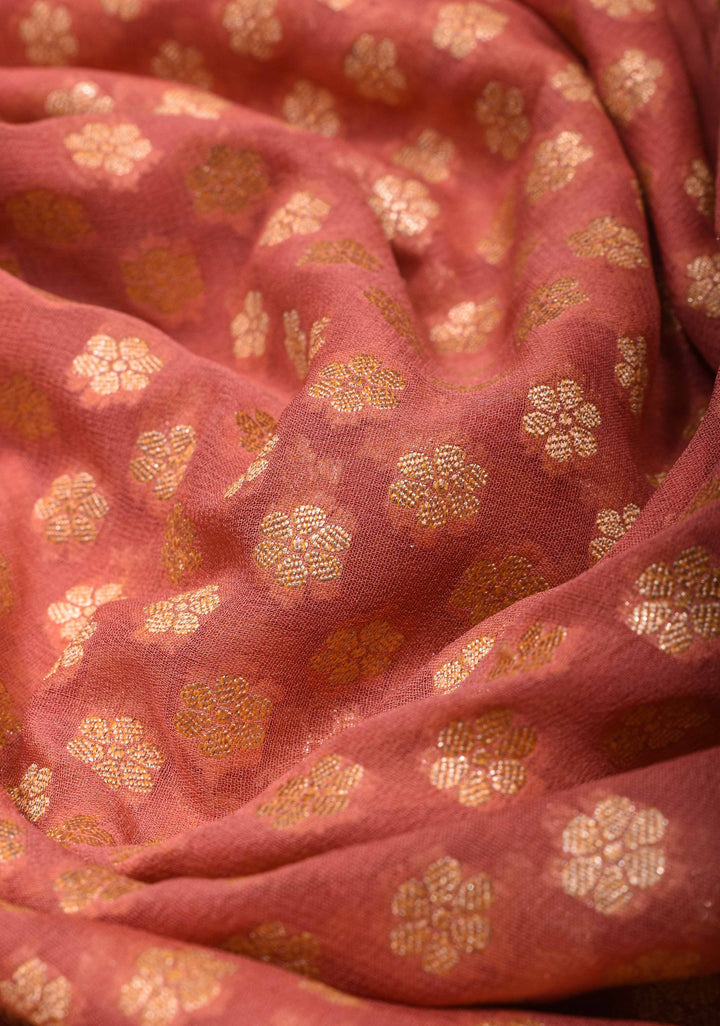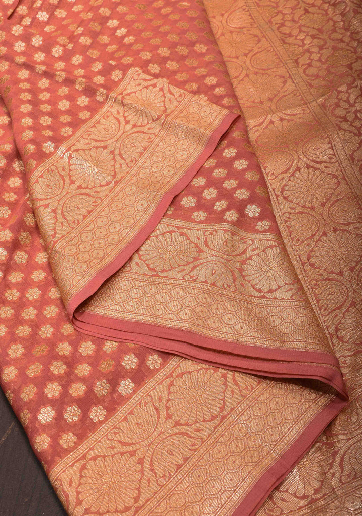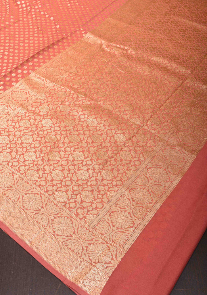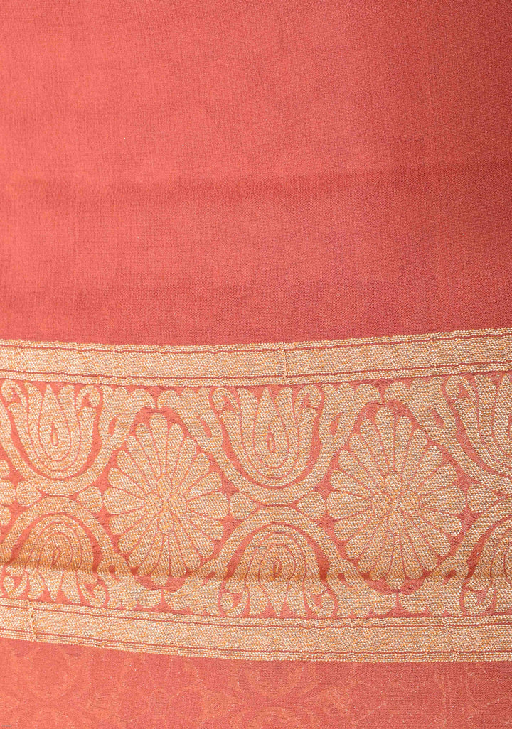 This Salmon Pink Banarasi Georgette Silk Saree radiates elegance and charm with its soft, warm salmon pink hue. The georgette silk fabric drapes beautifully, offering both comfort and grace. The saree is adorned with intricate zari buttis, creating a subtle shimmer that enhances its timeless appeal. A delicate zari border completes the look, adding a sophisticated, regal touch. Ideal for weddings, festive occasions, and special events, this Banarasi saree seamlessly blends traditional craftsmanship with contemporary elegance.