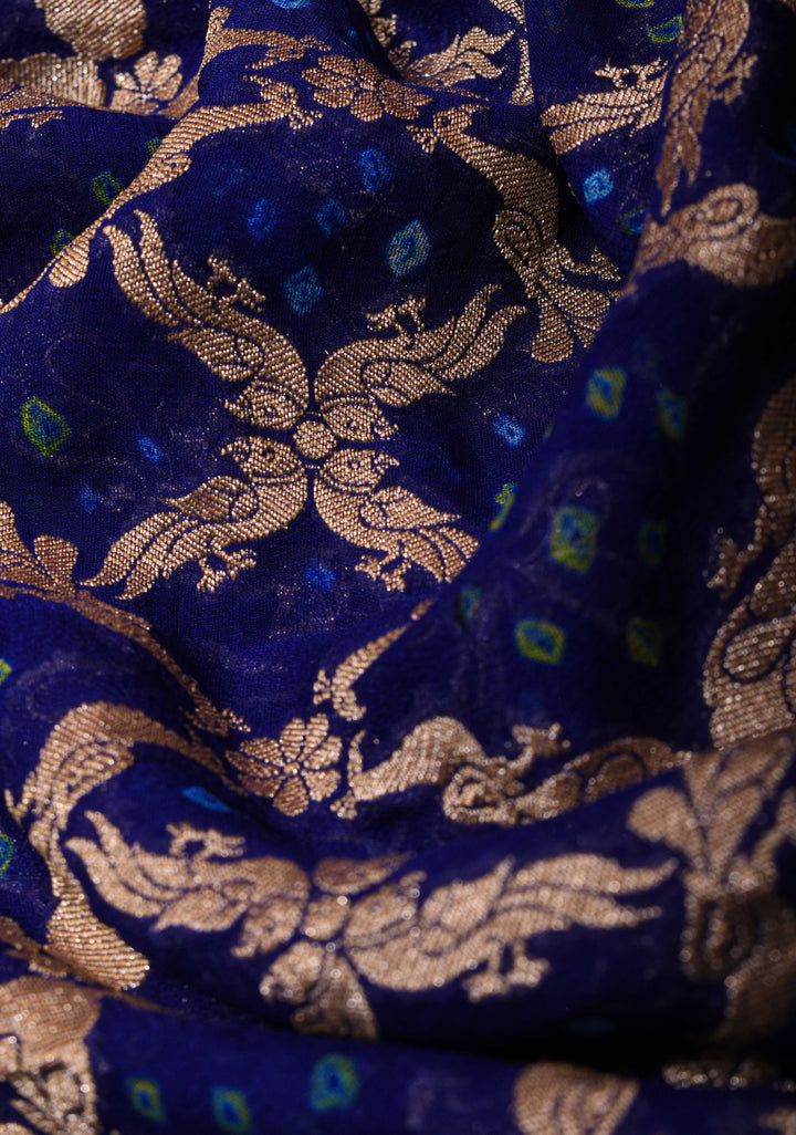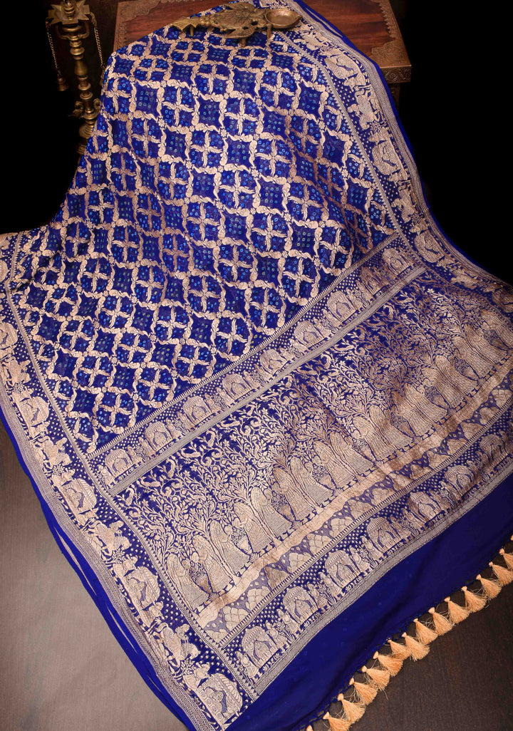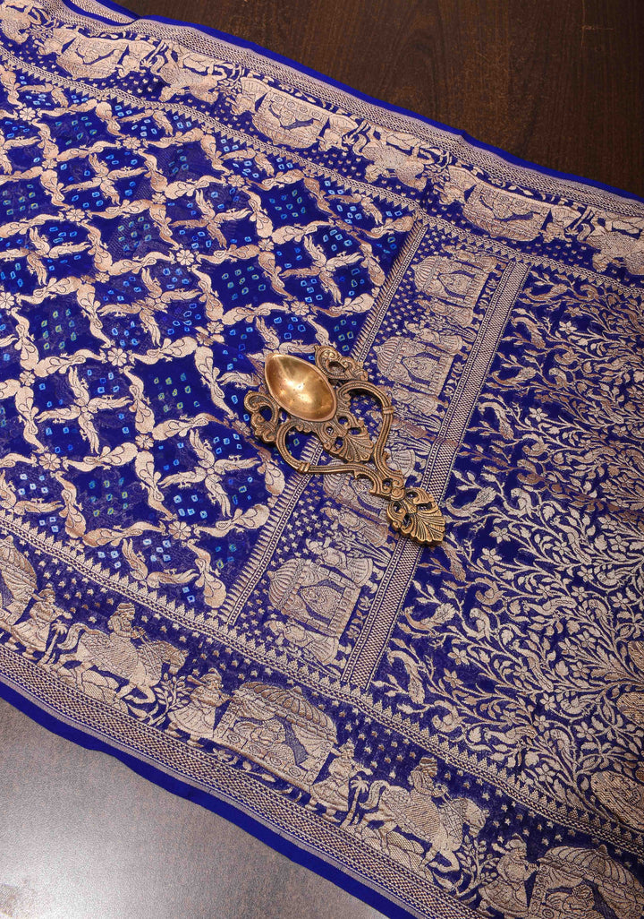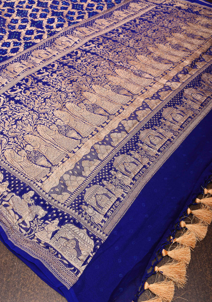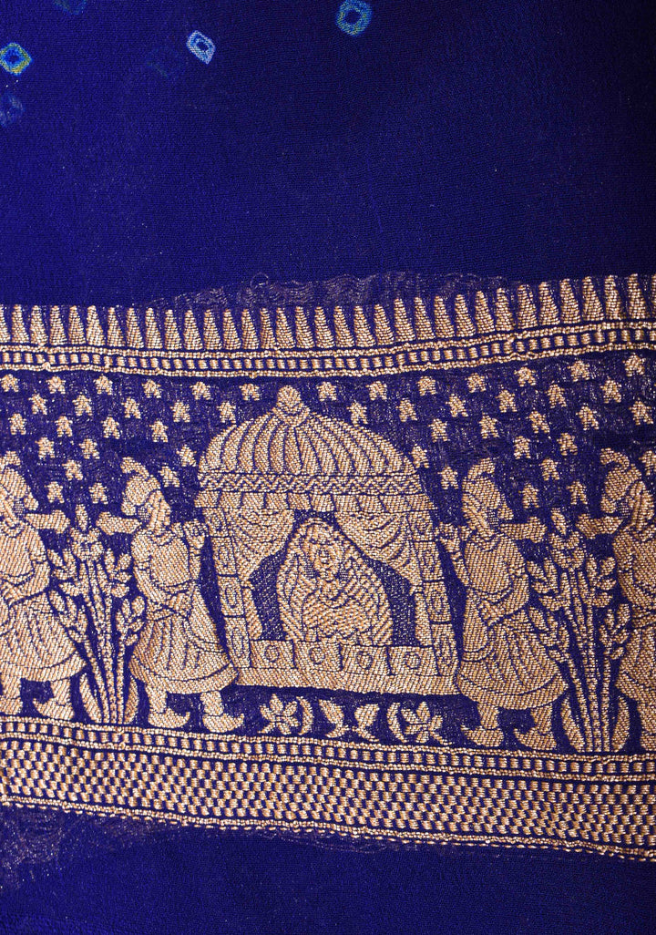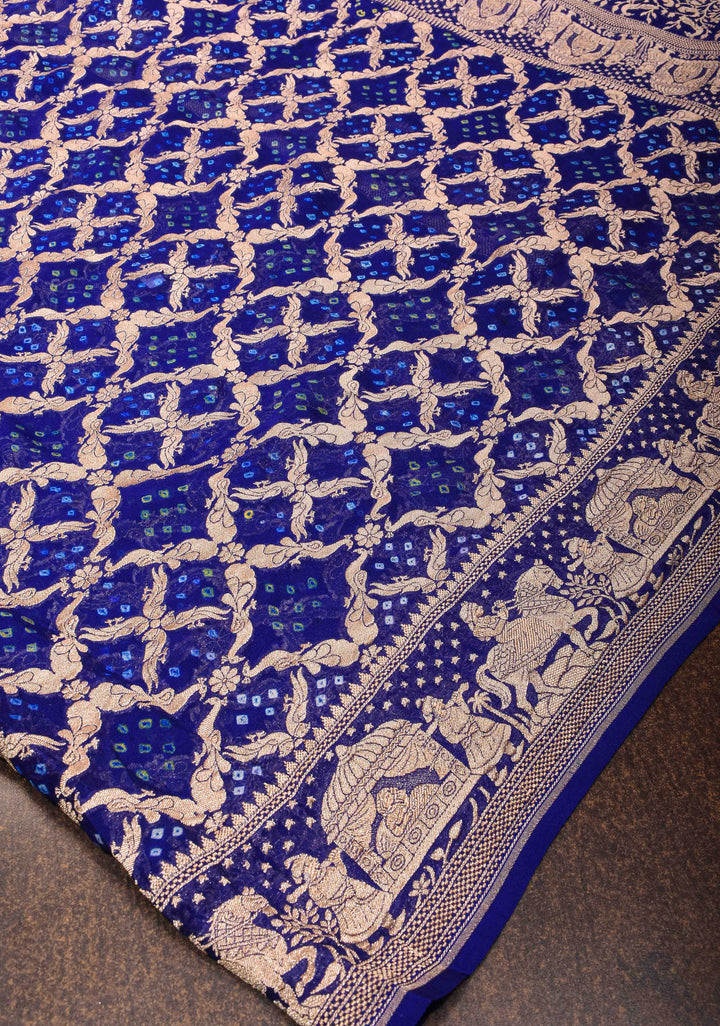 This Navy Blue Bandhej on Shikaargah Jaal Pure Silk Georgette Banarasi Saree is a stunning blend of traditional artistry and luxurious fabric. The Bandhej tie-dye technique, paired with the intricate Shikaargah jaal pattern, creates a regal look, while the royal procession design adds a touch of grandeur and elegance.