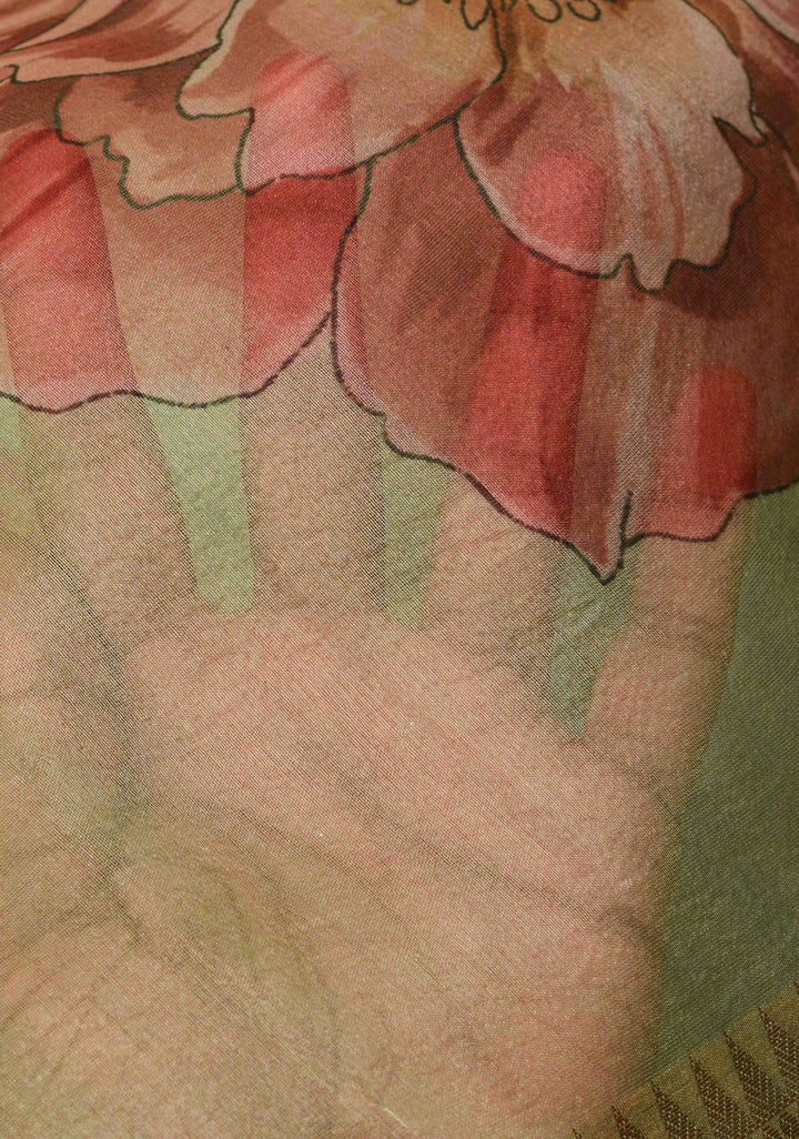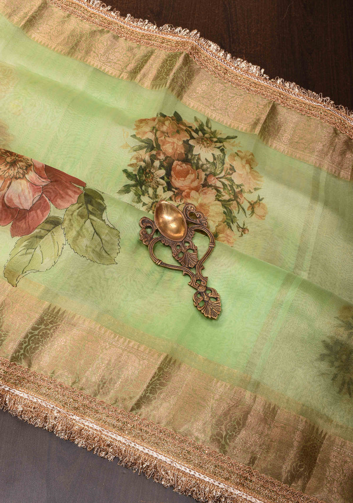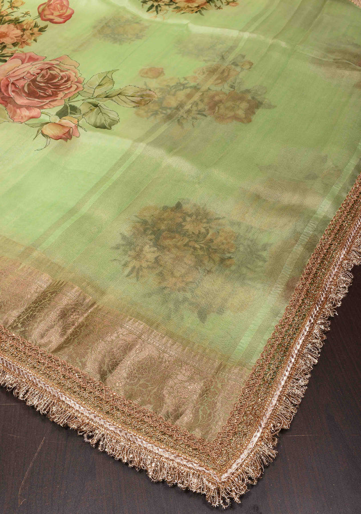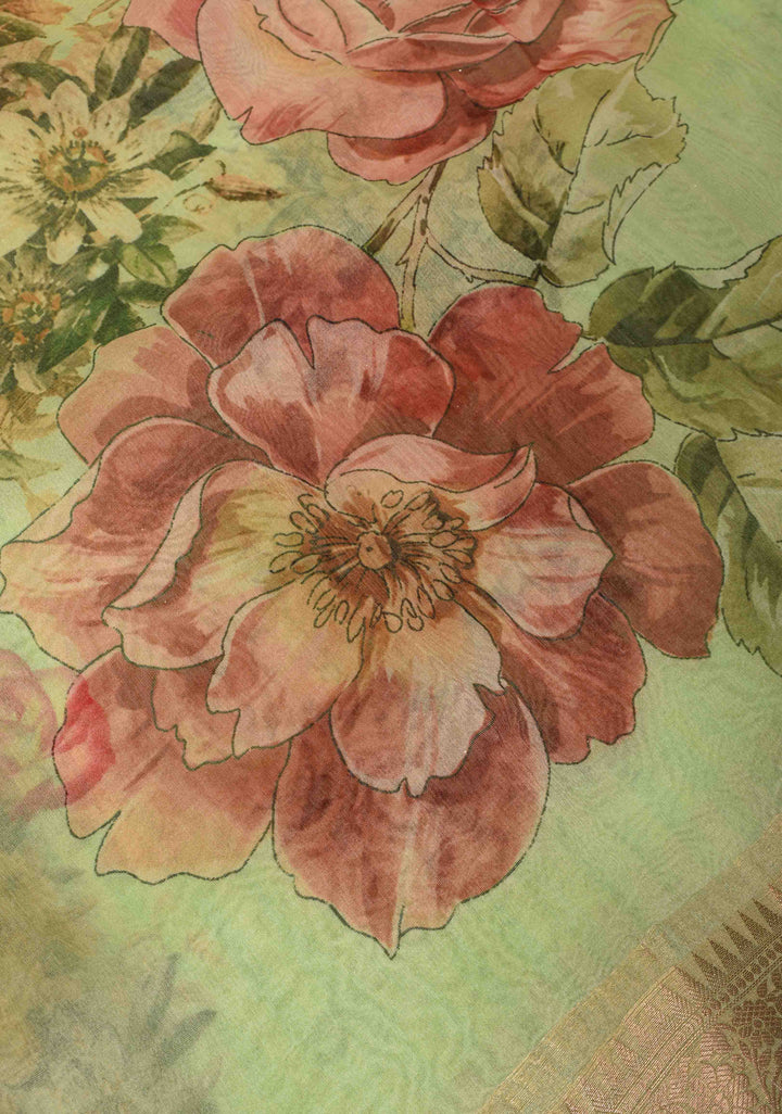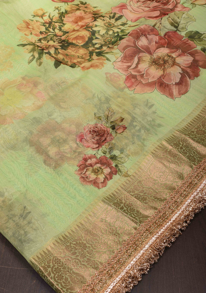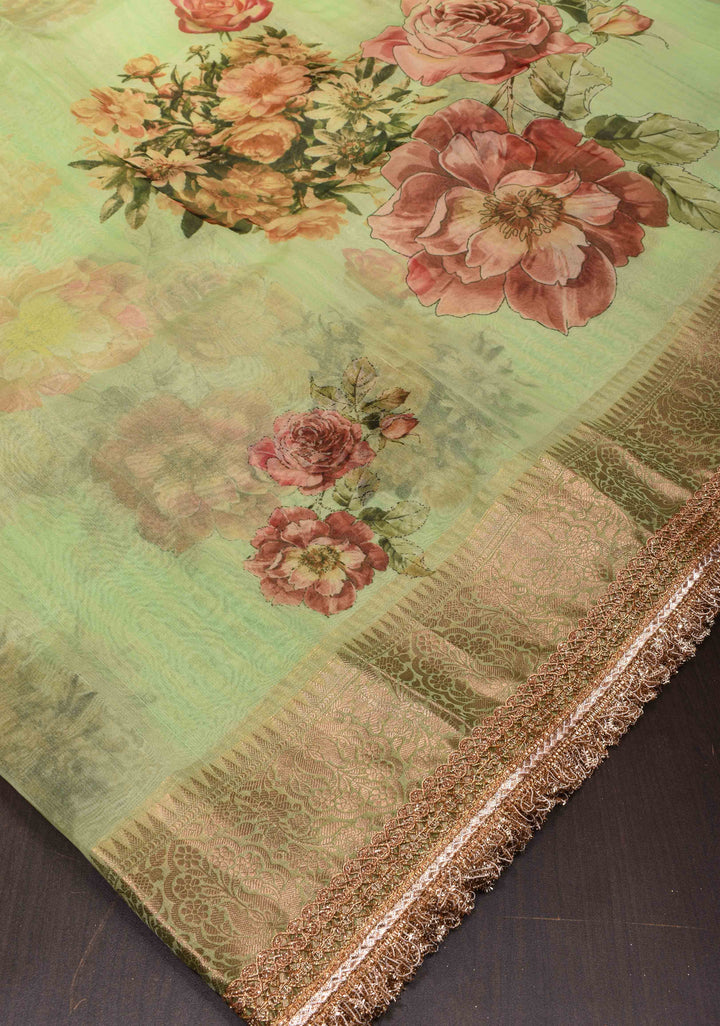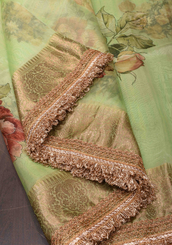 Add a touch of natural elegance with this Pistachio Green Pure Organza Silk Saree, featuring exquisite floral digital prints that bring a modern flair to traditional style. The lace trim border adds an intricate, refined finish, elevating the saree's beauty. Crafted from lightweight organza silk, this saree offers a graceful drape and luxurious feel, making it perfect for weddings, festive events, and formal gatherings. The combination of earthy tones and delicate detailing creates a timeless and versatile piece for any special occasion.