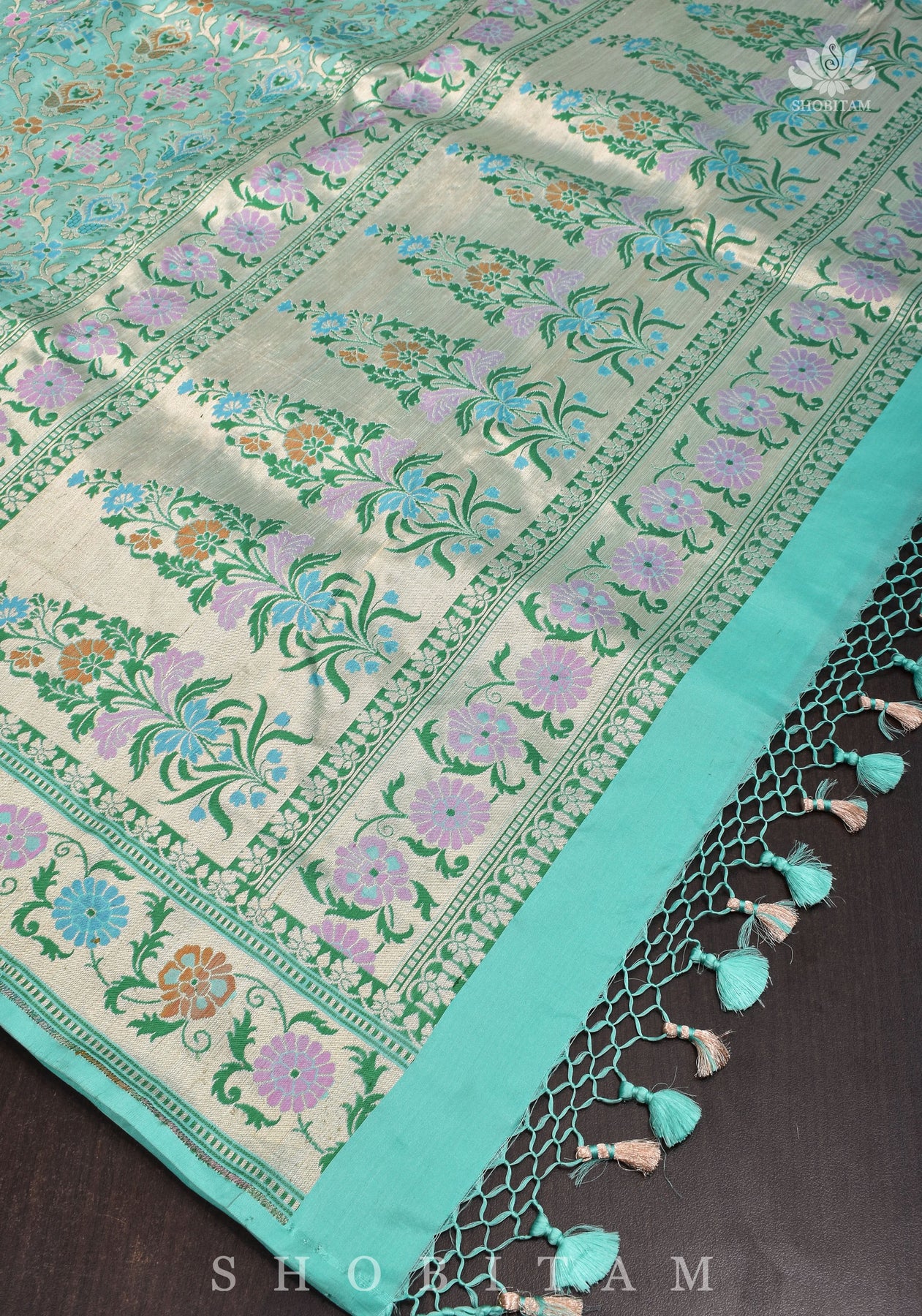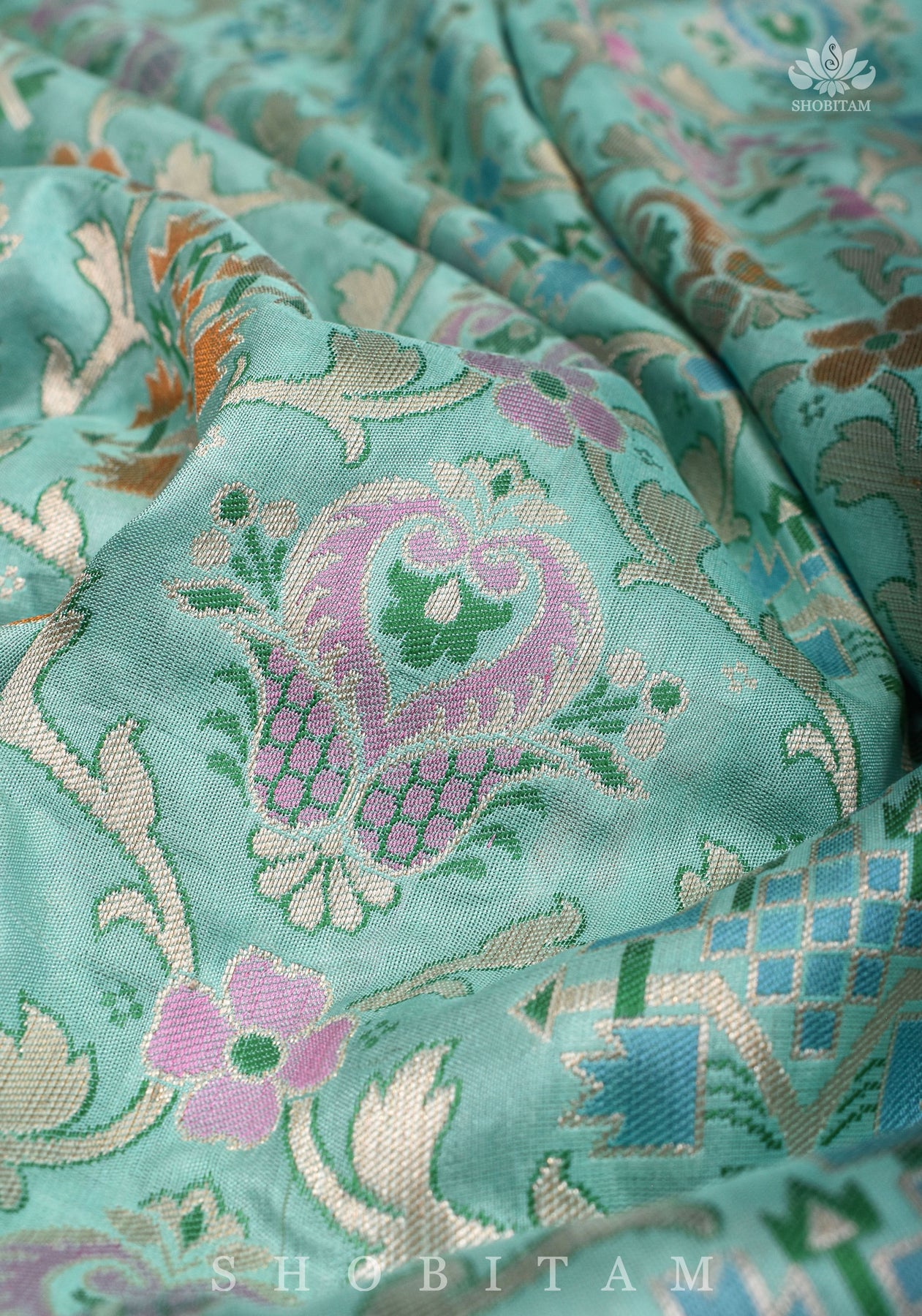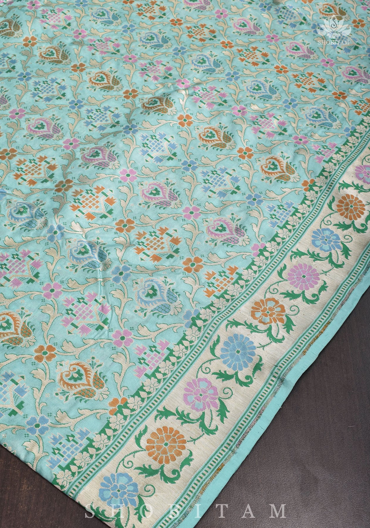 This exquisite Aqua Green Banarasi Katan Silk Saree is a vibrant showcase of heritage weaving and refined elegance. The body is adorned with an intricate Meenakari Patola brocade jaal, featuring multicolored motifs woven with exceptional detail and finesse. Crafted from Katan silk, the saree has a lustrous finish and a smooth, luxurious drape. A finely woven zari border frames the saree, adding a regal touch to its traditional charm. Perfect for weddings, festive occasions, and grand celebrations, this saree is a statement piece that blends the grandeur of Banarasi artistry with the brilliance of Patola-inspired designs.