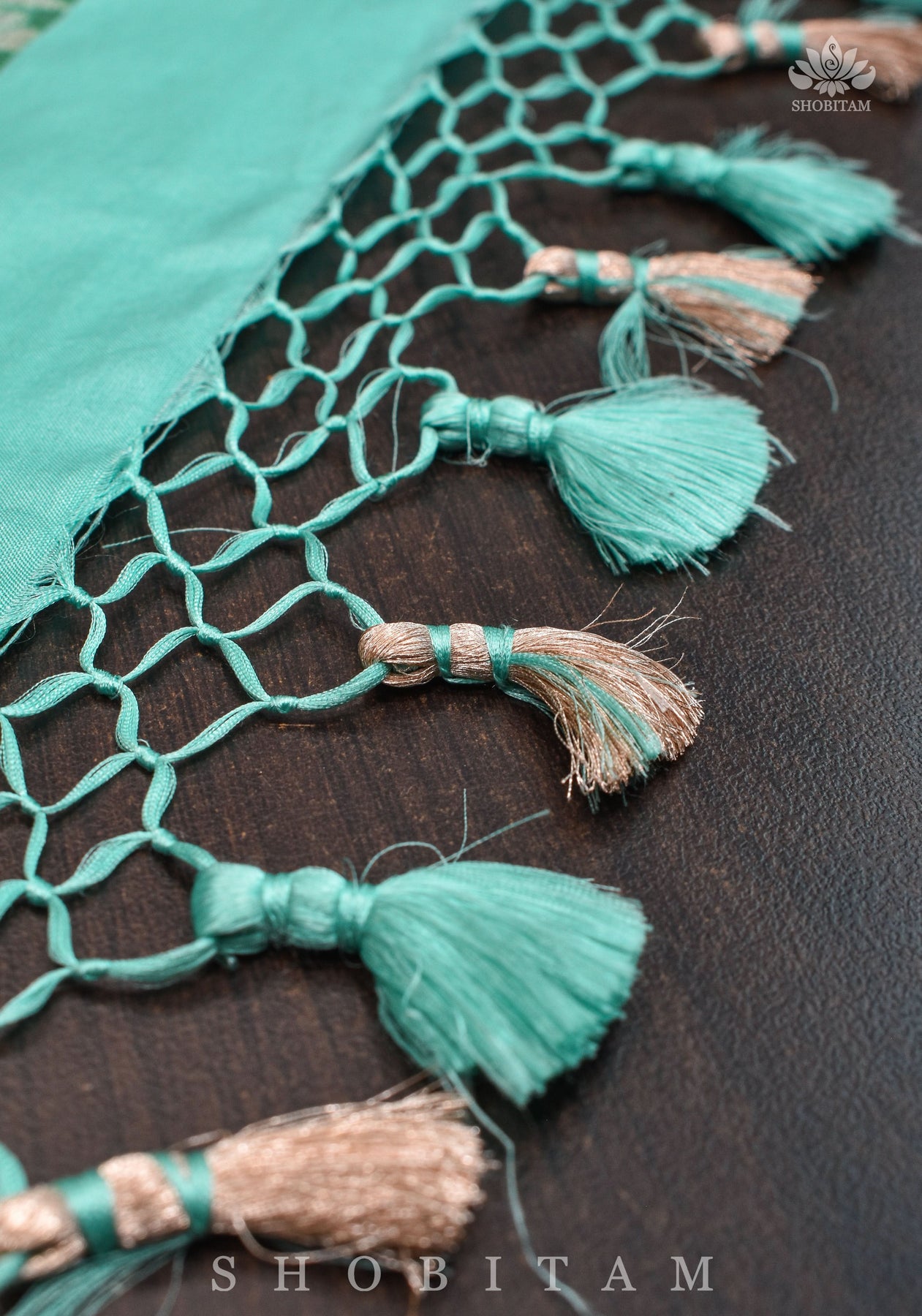 This saree is ready to wear with fall and pico done. Handmade silk tassels adorn the pallu and add more grace to it. An unstitched blouse fabric is included.
