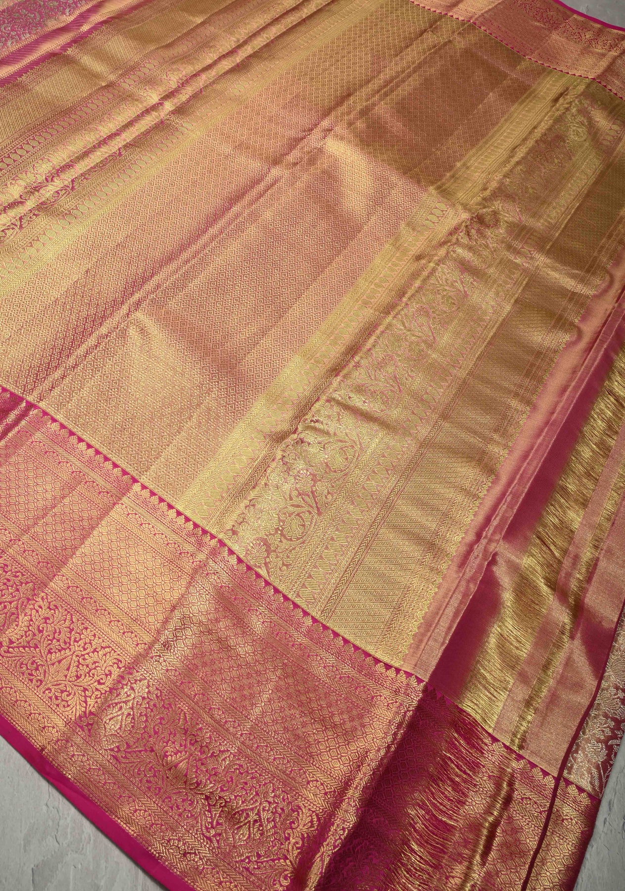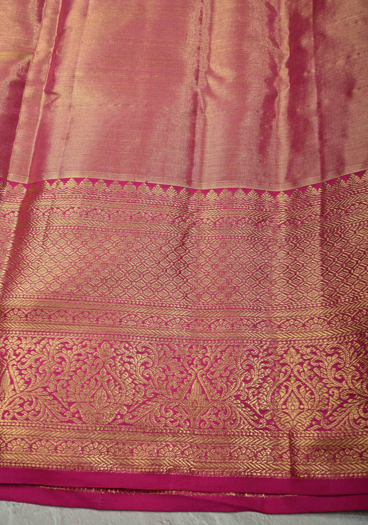 Radiate elegance in this Pink Dual Tone Tissue Kanjivaram Pure Silk Saree, crafted from premium dual-tone tissue silk for a finish. Adorned with intricate Meenakari floral jaal brocade, this saree showcases delicate artistry and traditional charm. The contrast zari border adds a regal touch, enhancing its overall sophistication. Perfect for weddings, festive occasions, and special celebrations, this saree drapes gracefully, offering a timeless and graceful look. Pair it with classic jewelry for a complete heritage-inspired ensemble.