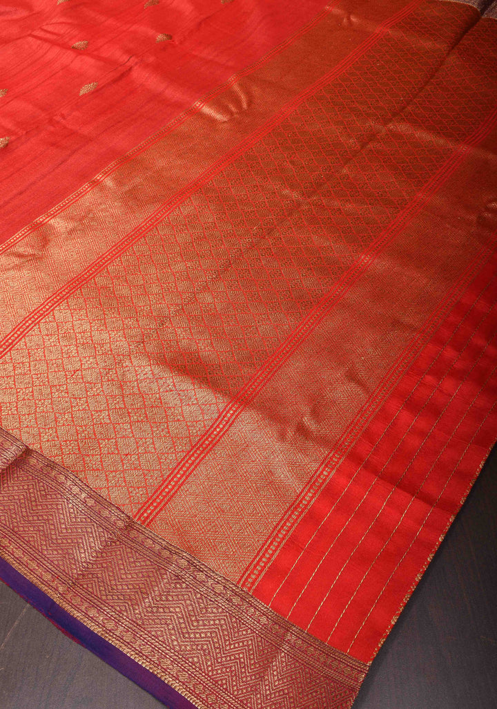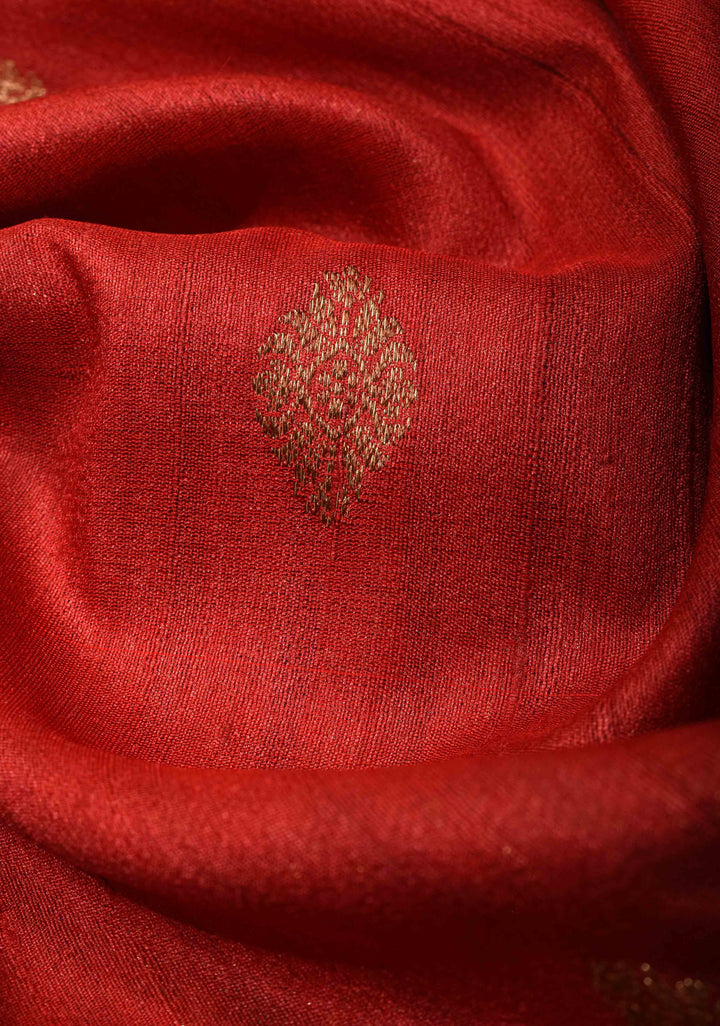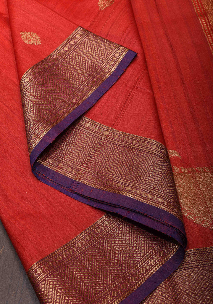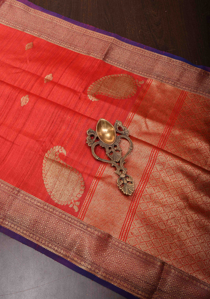 This stunning red Pure Banarasi Tussar Silk Saree showcases traditional craftsmanship with delicate zari buttas and intricate Koniya motifs, making it a perfect blend of classic and contemporary design. The zari border adds an extra touch of elegance, enhancing the saree's luxurious appeal. Crafted from Tussar silk, it offers both comfort and style, making it ideal for weddings, festive celebrations, and other special occasions. The vibrant red color and exquisite detailing make this saree a timeless addition to any wardrobe.