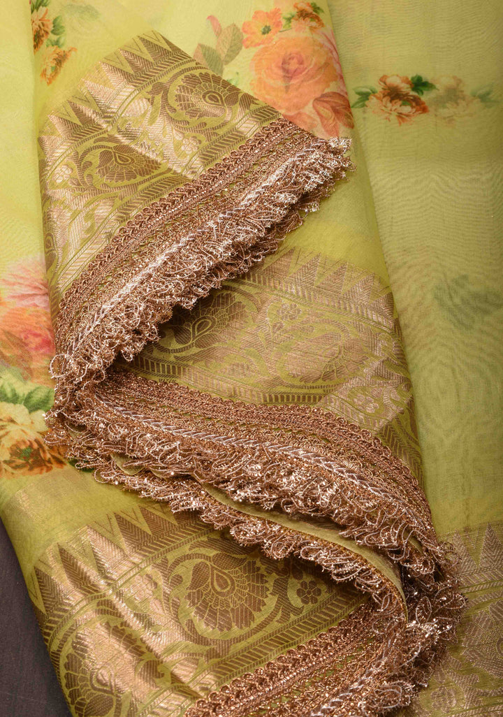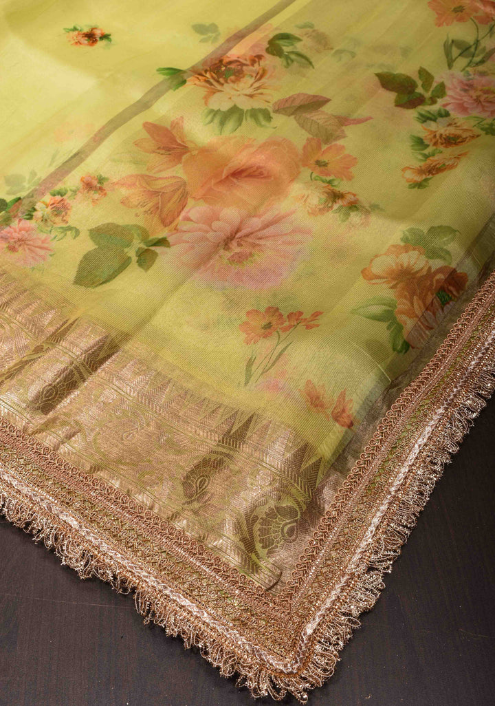 Add a burst of sunshine to your wardrobe with this Pure Organza Silk Saree in a refreshing lemon yellow shade. Featuring exquisite floral digital prints, this saree captures the essence of elegance and charm. The delicate lace trim border enhances its graceful appeal, making it a perfect choice for festive celebrations, weddings, and daytime events. Crafted from lightweight organza silk, this saree drapes beautifully, offering both style and comfort for any occasion.