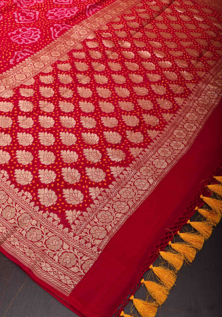 This Sarkam Bandhni on Banarasi will help you create an impact on any occasion quite effortlessly. The precious Sarkam Bandhini technique is both artistic and mathematical. The technique involves intricately placing thousands of dots and hand knotting, pinching, and resist-dying them to create figurative patterns. Dip-dying them in a bouquet of colors gives them myriad patterns making each drape a unique expression of art.